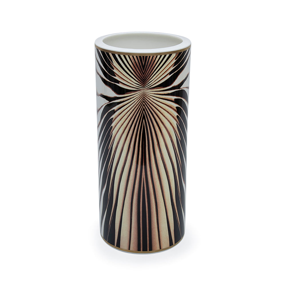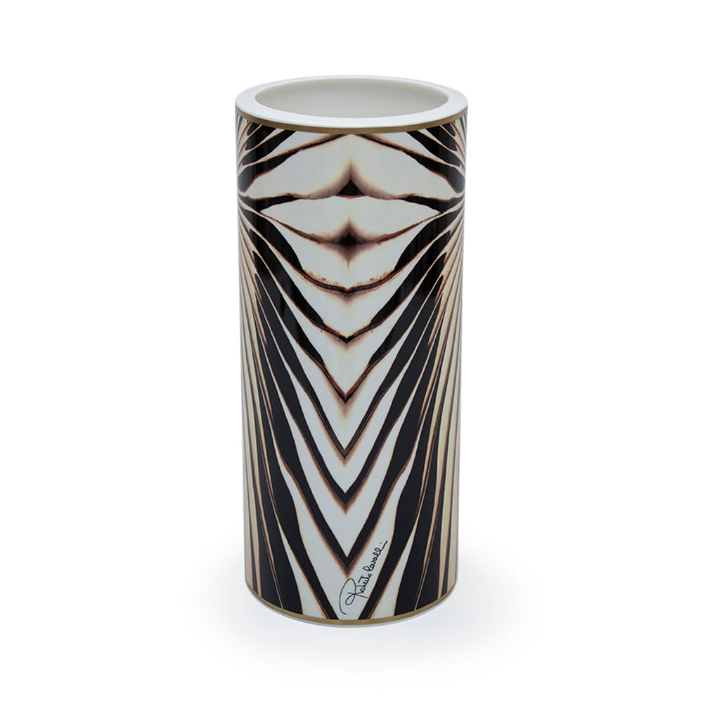 Fine bone china porcelain tall size cylindrical vase with bold tiger animal stripe transfer print and gold accents which carries the distinctive Cavalli signature and style. Ideal for creating stunning flower or plant arrangements.