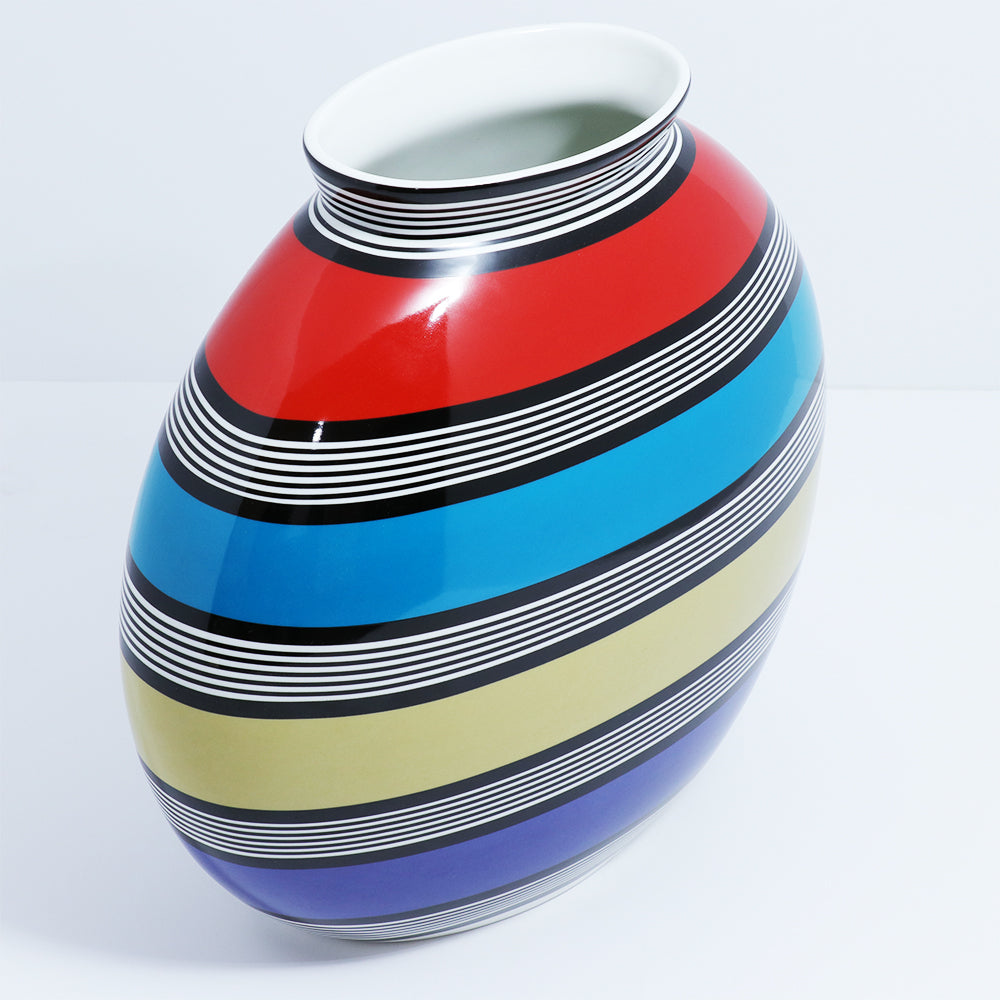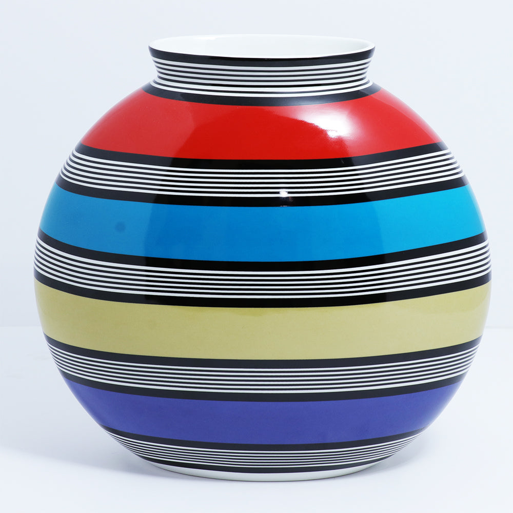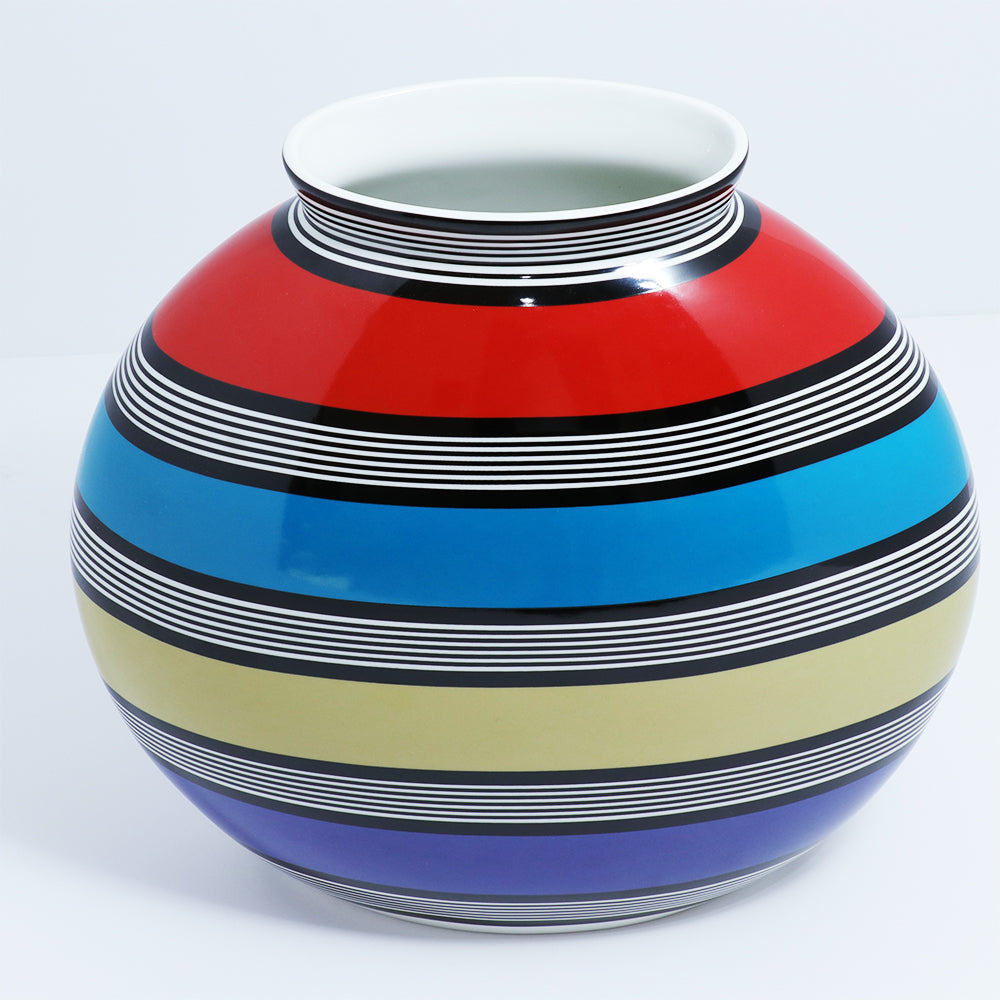 From Missoni Home's the Richard Ginori 1735 edit, the large Sunrise vase is immaculately sculpted from the smoothest porcelain to a defined circular shape. Embracing the collection's vintage appeal, it sees colour-block panels offset with diminutive monochrome stripes, replicating the vibrancy and detail expected of the Italian homeware label and undeniably making a statement in a living or bedroom space.