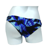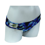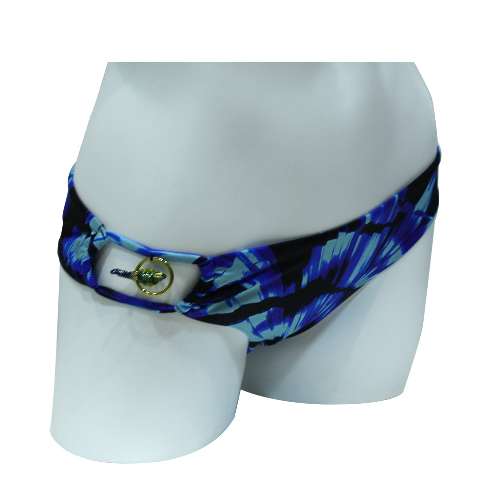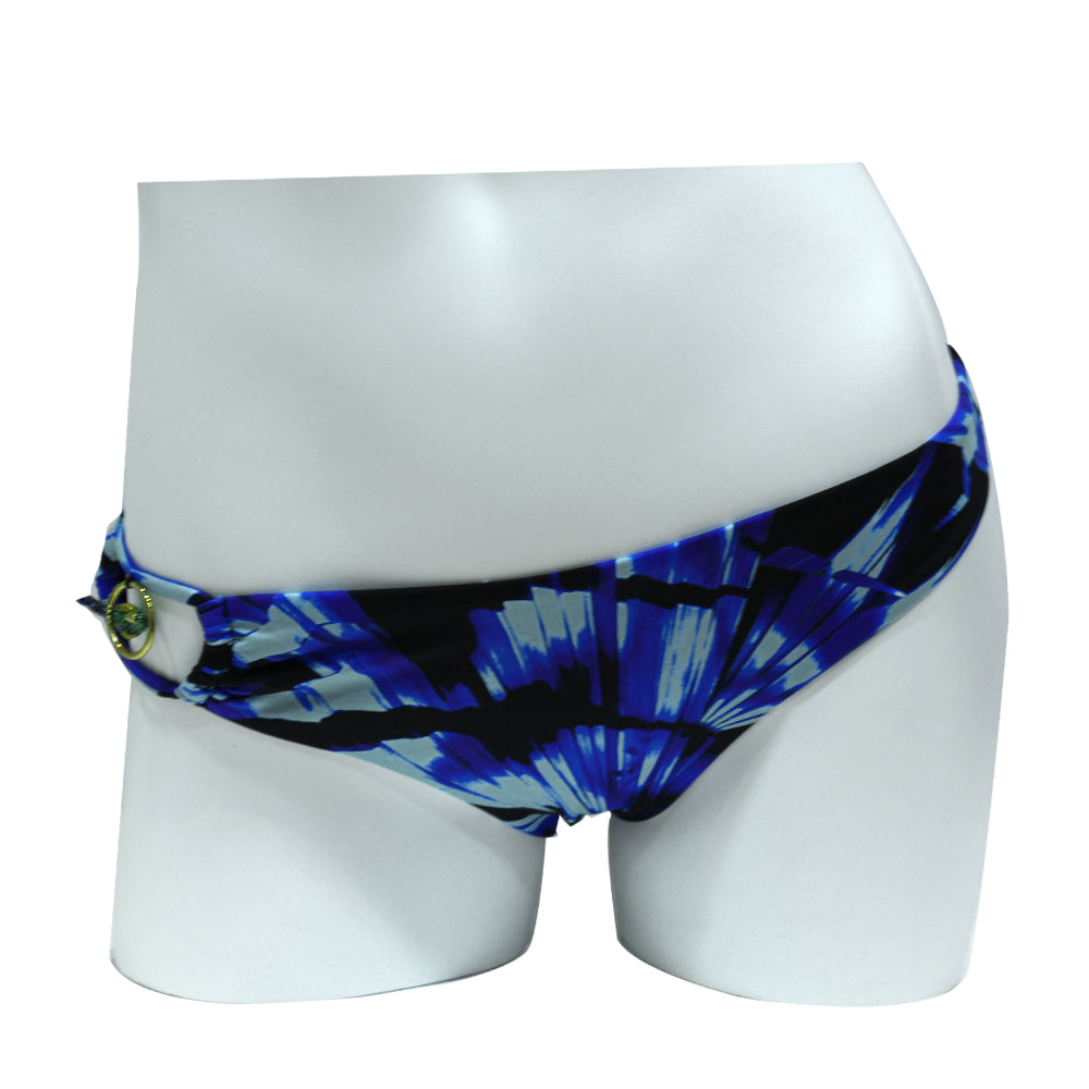 A bikini brief with a print of blue black colorway pops against the background of these medium coverage. They're made in Italy, fasten with adjustable side ties and feature a gold tone metal detail at the hip.