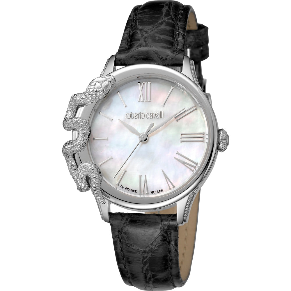 Roberto Cavalli Ladies Watch Black Leather Strap Silver Case With Mother Of Pearl Dial And Sapphire Glass