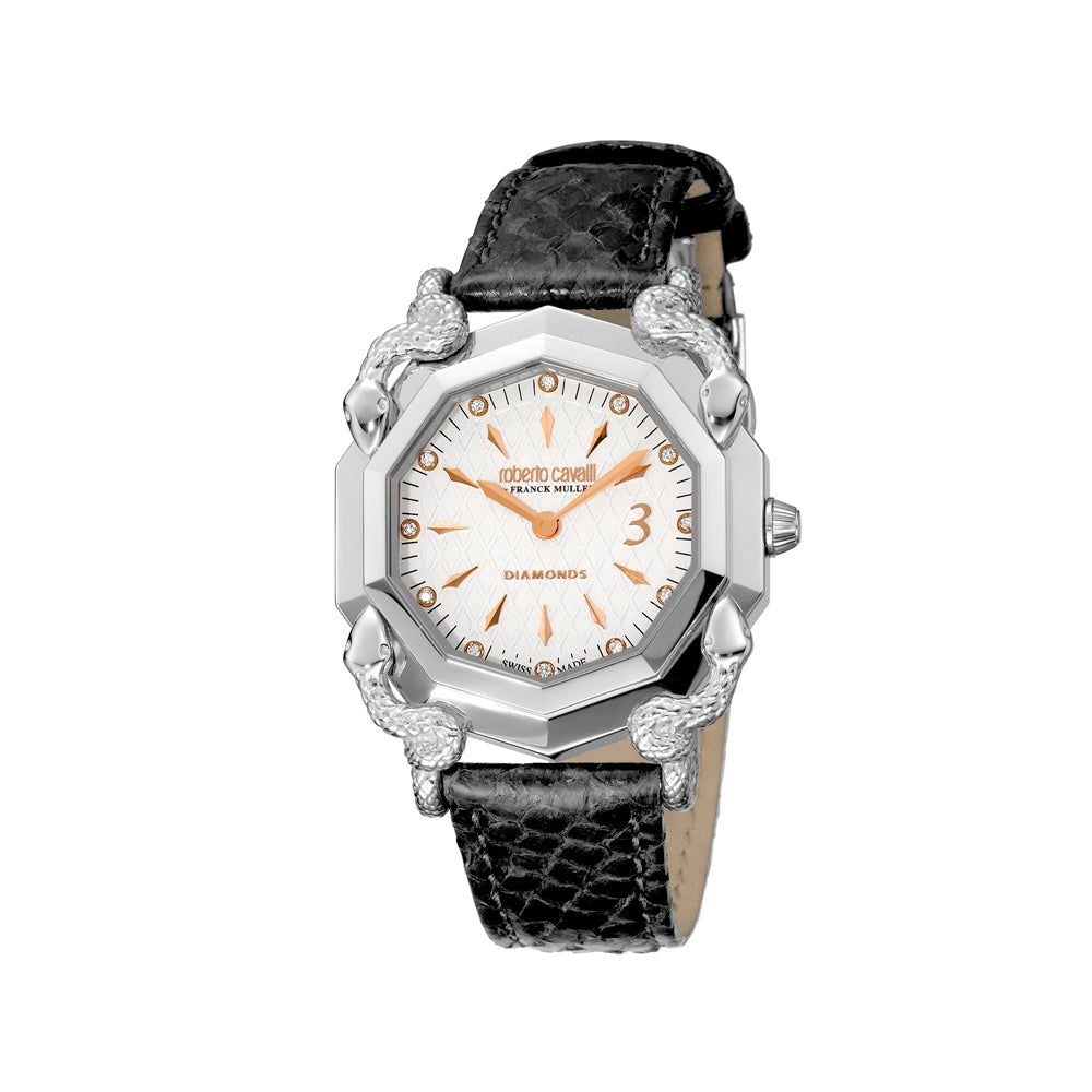 Roberto cavalli watch ladies black snake skin with leather strap silver case and white dial/sapphire glass