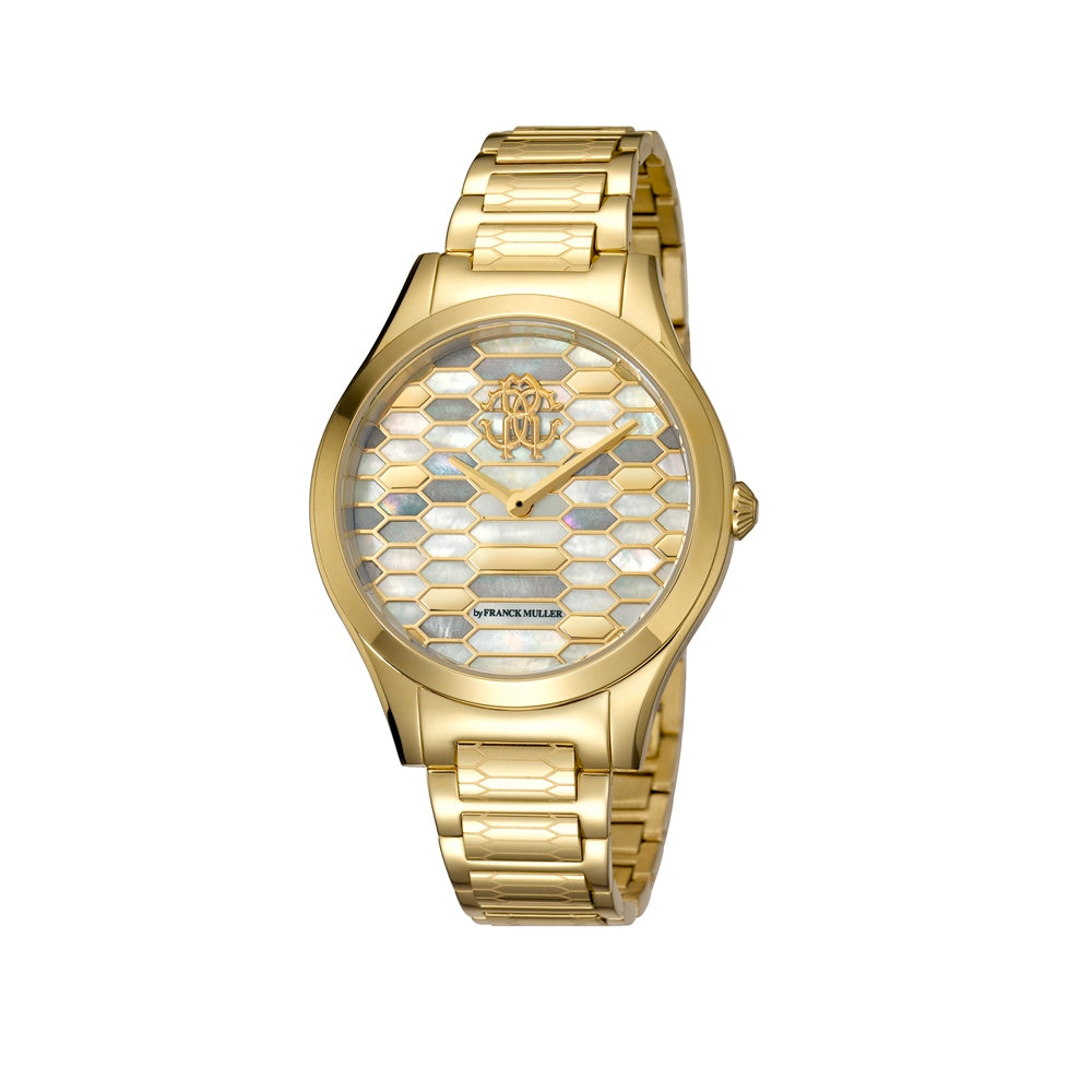 Roberto Cavalli Ladies Watch With White Mother Of Pearl Dial & Golden Color Metal Bracelet