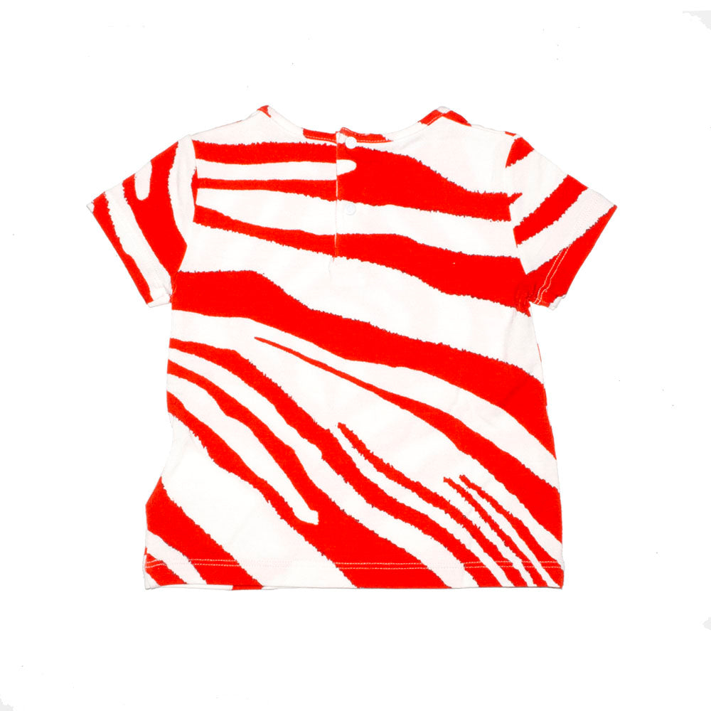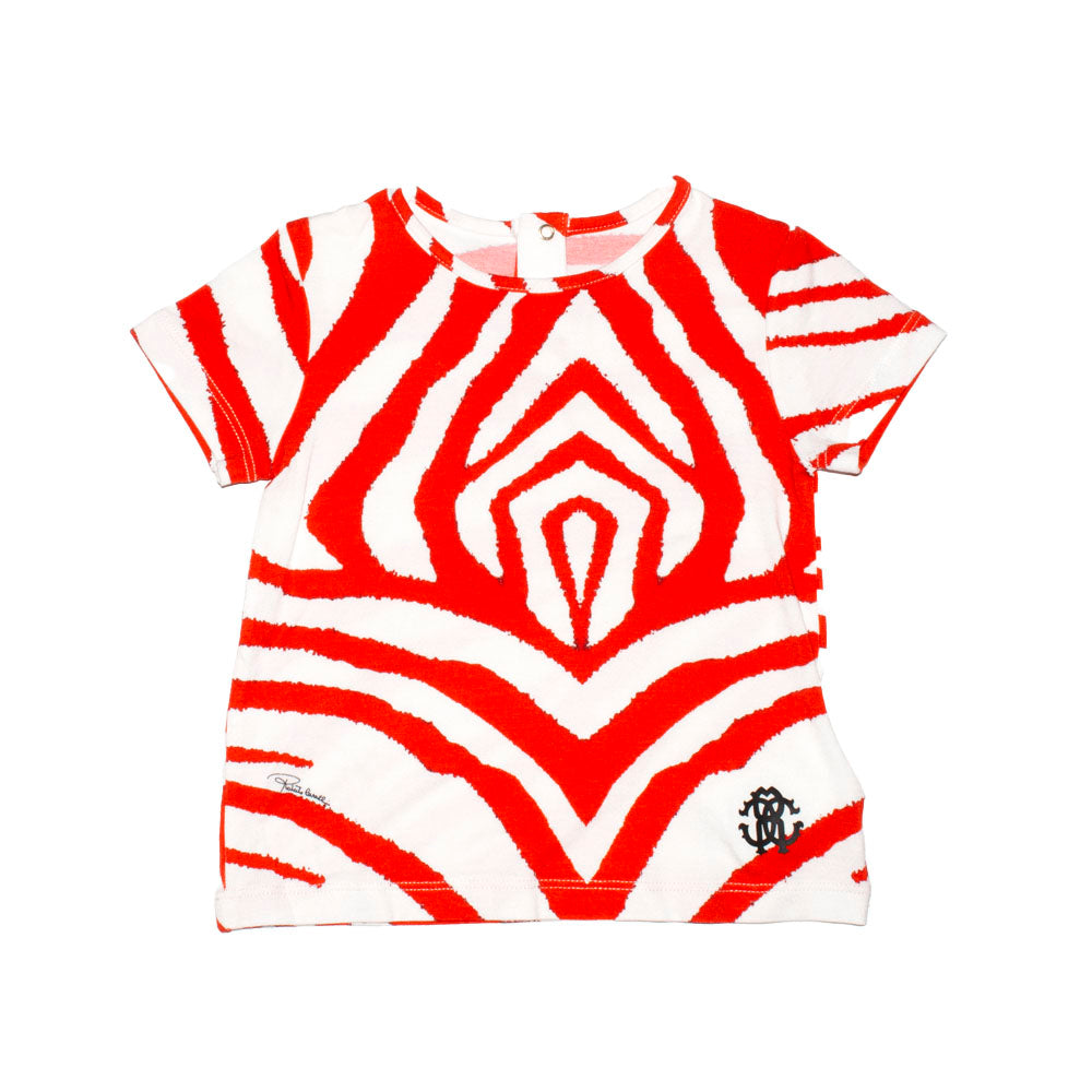 The Roberto Cavalli Red and White T-Shirt is a stylish and eye-catching piece. It is made from soft and comfortable cotton-jersey material, making it perfect for everyday wear. The T-shirt features a round neck and is designed with a red and white zebra print all over the bodice. The back of the shirt has a snap button closure for a unique touch. The shirt also features a contrasting black logo print on the front, adding a subtle pop of color to the overall design. It has a relaxed and easy fit, making it a versatile and comfortable choice for any occasion. The short sleeves provide a casual look and feel, perfect for pairing with jeans or shorts. This T-shirt is a perfect addition to any wardrobe, adding a touch of boldness and style to any outfit. It is a statement piece that can be dressed up or down, making it a must-have for any fashion-forward individual. The Roberto Cavalli Red and White T-Shirt is a unique and trendy choice for those looking to make a fashion statement.