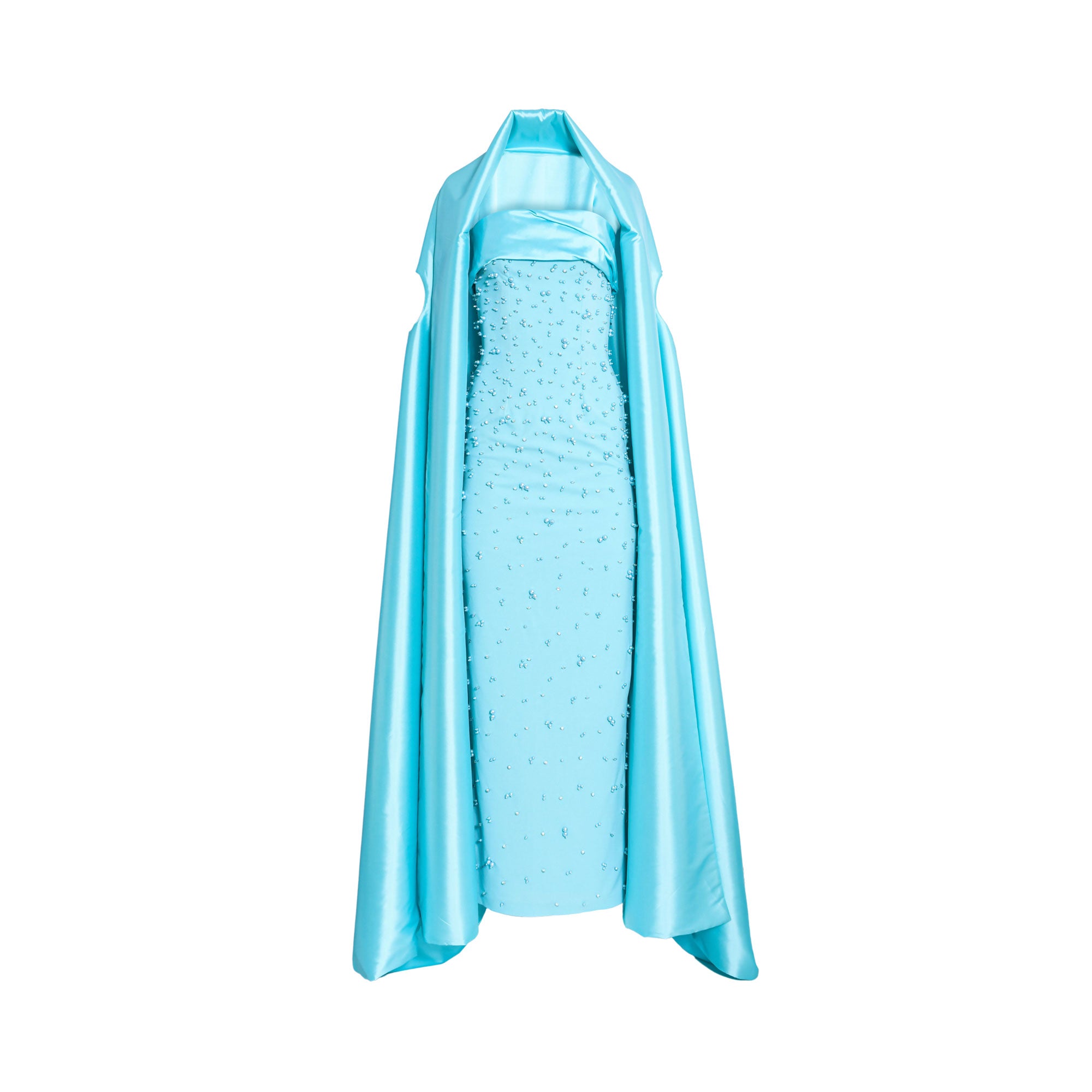 This gorgeous dress is sure to make an impression! The neckline is a straight across gathered tafta, giving you an elegant look. The floor length fabric is made from scuba, and it is embellished with crystals and pearls for a stunning, sparkly effect. To complete the look, there is a delicate tafta cape which drapes elegantly over your shoulders. Whether you're attending a formal event or a special occasion, this dress is sure to turn heads, and make you look like royalty! SPECIFICATIONS
