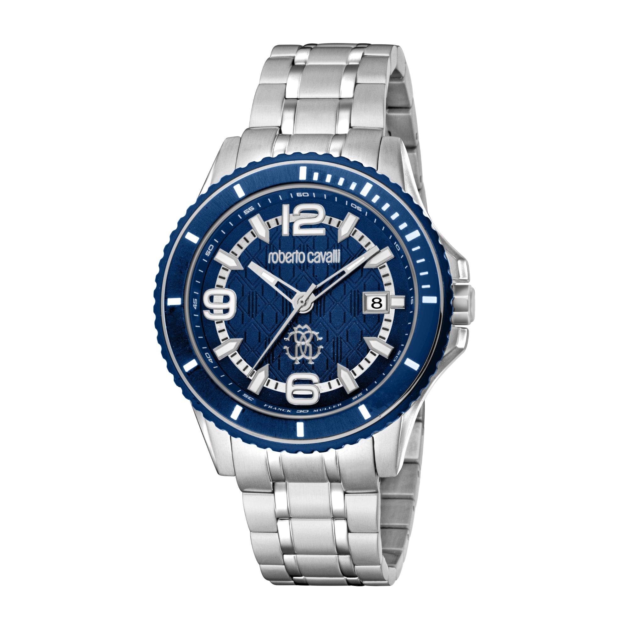 Roberto Cavalli Gents Blue Dial, Silver and Blue Stainless Steel Case, Stainless Steel Bracelet Watch