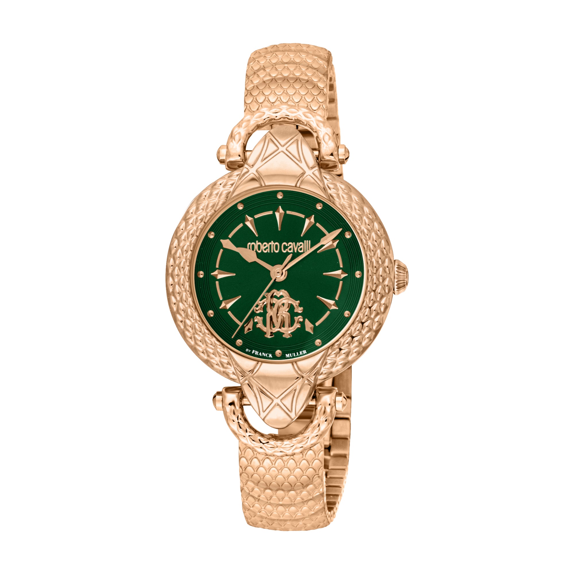 Roberto Cavalli Ladies Watch - Rose Gold Case, Dark Green Dial, Rose Gold Metal Bracelet