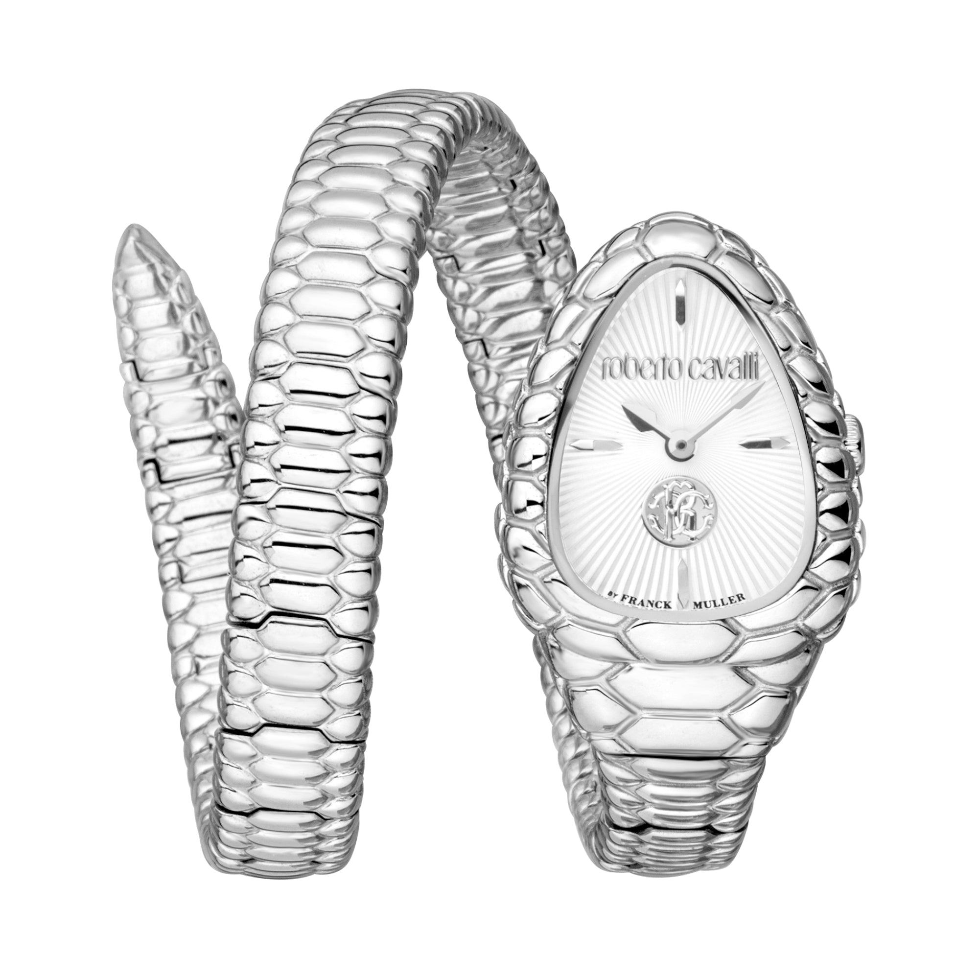 Roberto Cavalli Ladies Watch Serpent Head Silver Case, Silver Dial, Stainless Steel Bracelet