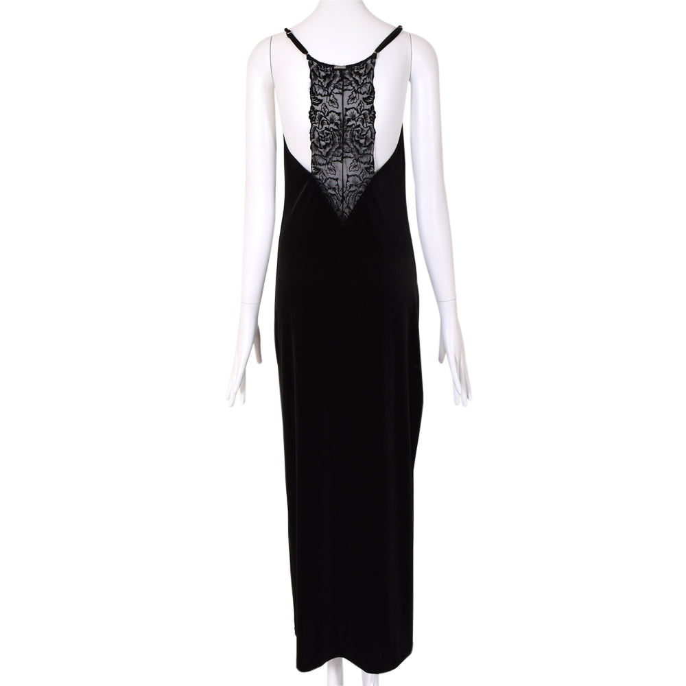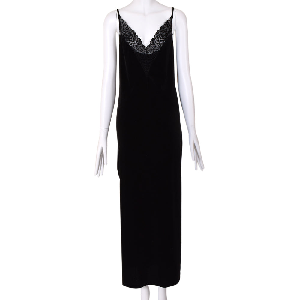 Long nightgown that is ideal for parties and events. It has adjustable and slim straps and a seductive side slit. A black gown with velvet touch and enhanced delicate details on the neckline.