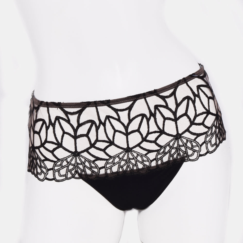 Low-rise panty with a boyshort cut. The front is covered in beautiful lace that is so detailed it looks almost painted on. Back with cheeky cut, features a seamless, 4-way stretch microfiber that's as smooth as a baby's backside. The bottom of this panty is lined in cotton for comfort and protection.