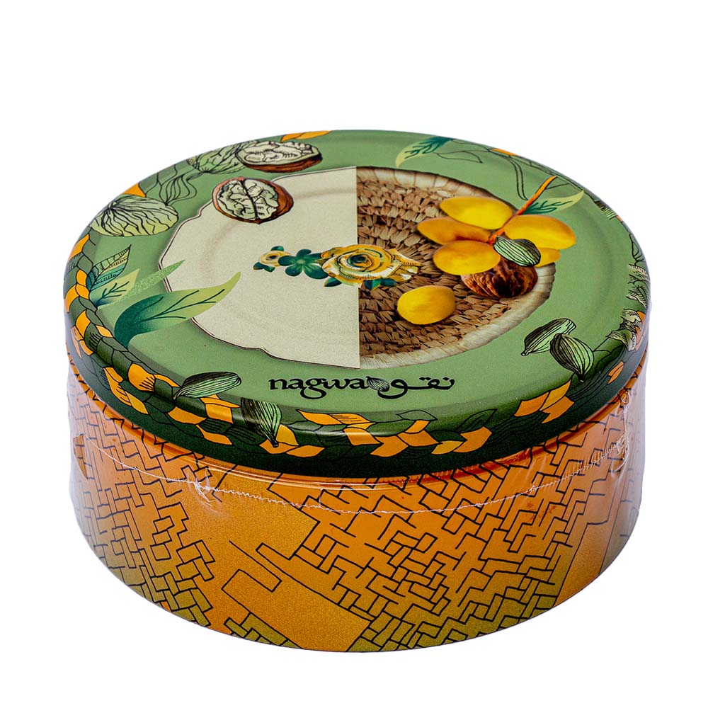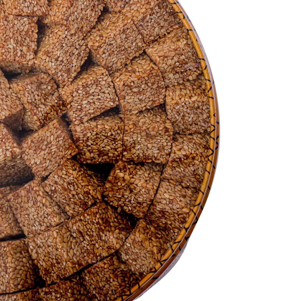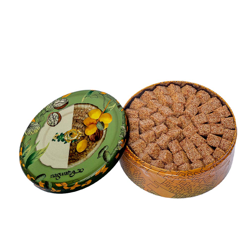 Nagwa Simsimiya is a traditional snack in Egypt consisting of a crispy layer of sesame seeds and date molasses. The sesame seeds are freshly roasted and hand-ground and the date molasses is a mixture of sugar and date syrup. The two come together to create this delicious, sticky candy. The candy is usually presented in small pieces cut into shapes of either tablets or stars, containing a thin layer of rich and flavorful sweet flavor. The most well-known version of the treat is dark yellow in color and contains around 88 pieces in each tin. Nagwa Simsimiya is a great snack to enjoy with tea or coffee as its slightly sweet taste will pair nicely. It is especially popular during Ramadan and a great way to celebrate the end of a day of fasting. Nagwa Simsimiya is a classic treat that should not be missed. Whether enjoyed as a snack or given as a gift, this unique combination of flavors is sure to bring smiles. SPECIFICATIONS