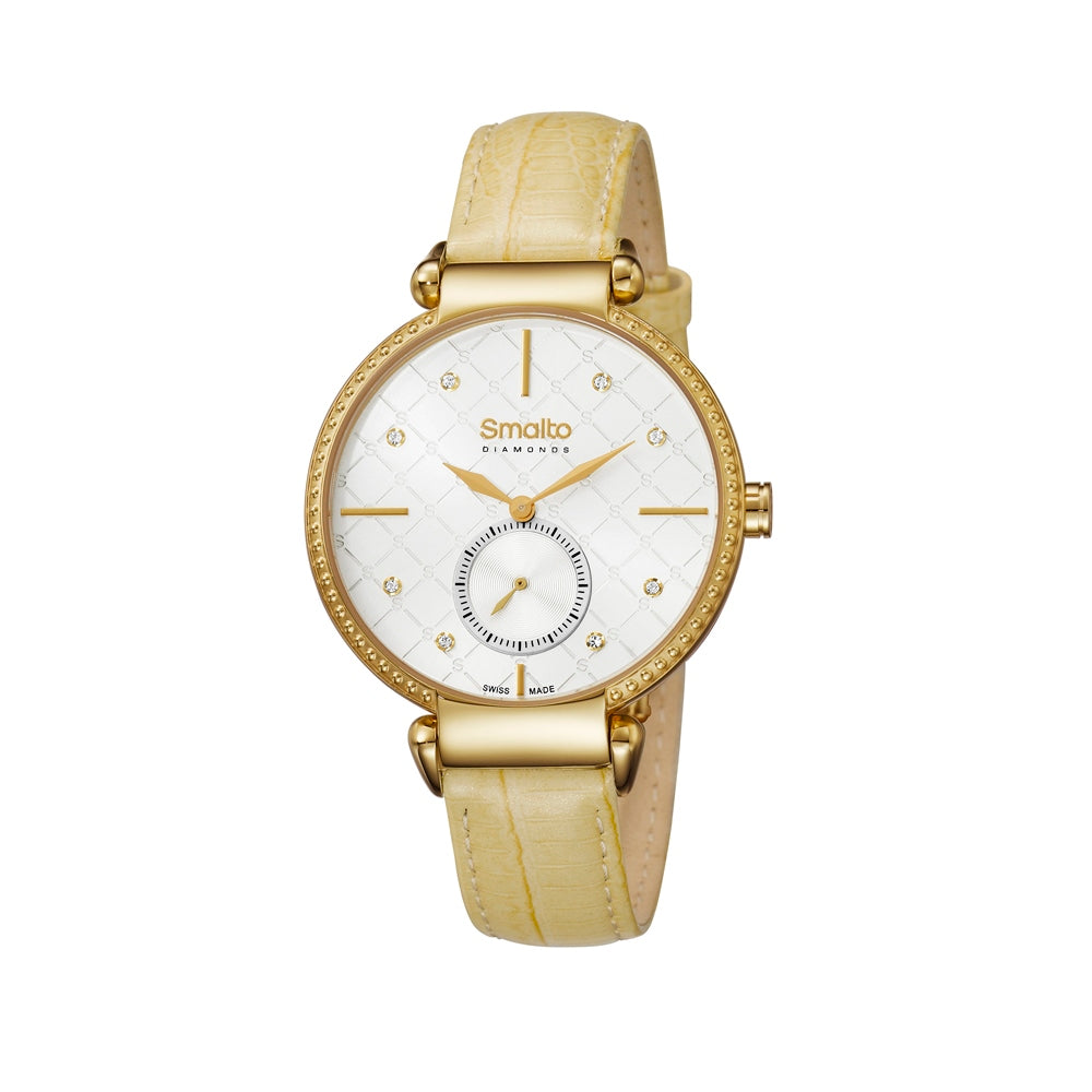 The Smalto Ladies Watch Ip Gold Case White Dial Cream Color Leather Strap With Diamond is an exquisite piece of quality jewelry that is sure to stand the test of time. This Swiss made timepiece is crafted from a solid gold case and features a round dial with three hands. The cream leather strap with a diamond encrustment adds a touch of sparkling elegance and is sure to make a statement no matter what the occasion. With its sophisticated design, water-resistant feature, quartz movement and sapphire crystal glass, this watch ensures an accurate time keeping experience and is sure to be a treasured piece in your collection. Whether you are looking for a timeless gift to yourself or a loved one, this is an ideal choice that is sure to be treasured for a lifetime. SPECIFICATIONS