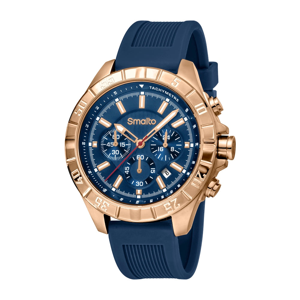 Smalto Watch Men's Chronograph Full Stainless Steel Case with Rosegold Plated / Blue Dial & Luminous Index & Hands with Date Indicator / Tachymetre Indicator & Water Resistant 10ATM with Blue Rubber Strap