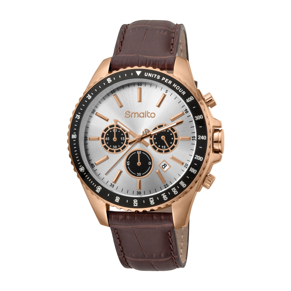 Smalto watch men's chronograph full stainless steel case with rosegold plated / black bezel with units per hour marker & steel dial / black sub-dial with date indicator & luminous hands / rosegold index & water resistant 10atm with brown leather strap