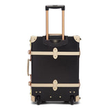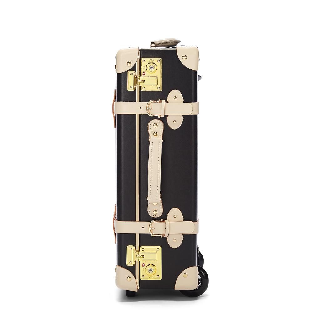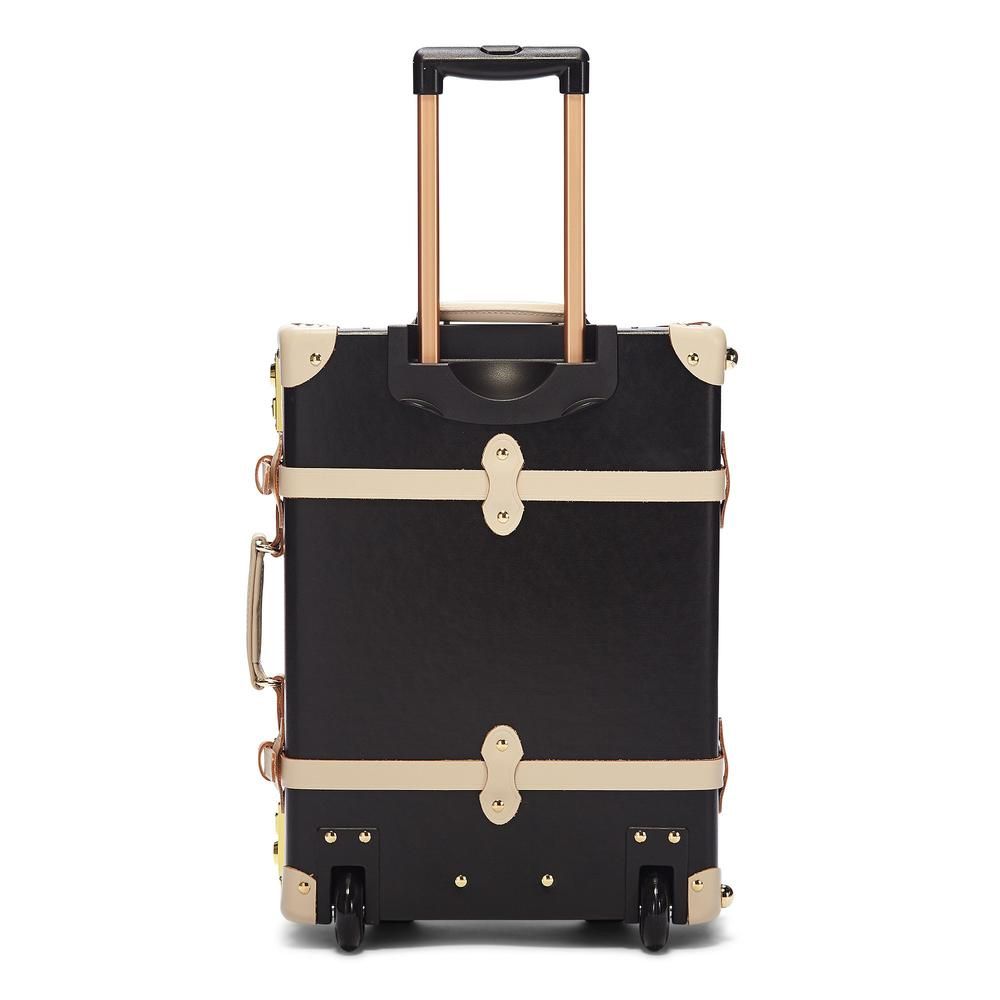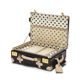 Back by popular demand, meet the Starlet Carryon, a vintage-inspired conversation starter and steady travel companion you will be proud to roll by your side from door to door. The sleek black body is accented with ivory straps and golden hardware for a statement exterior that opens to reveal a playful lining of black polka dots on ivory white.