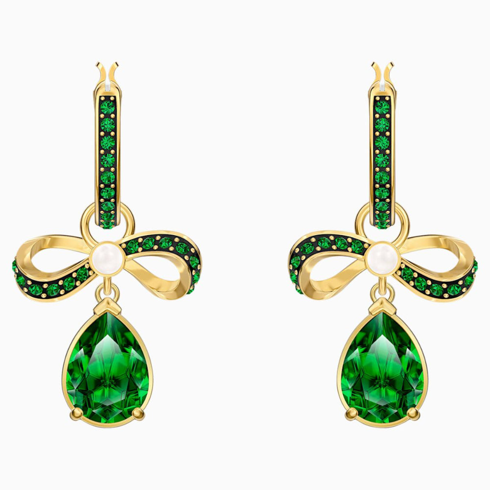 Our Black Baroque collection is inspired by the opulent and ornate design style of the Baroque period. Combining vintage elegance with fresh sparkle, this versatile pair of gold-tone plated hoop earrings is embellished with clear and emerald green-colored crystals. Wear them as simple hoops, with the bows and drops attached to create a longer silhouette, or asymmetrically.