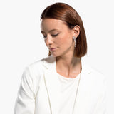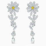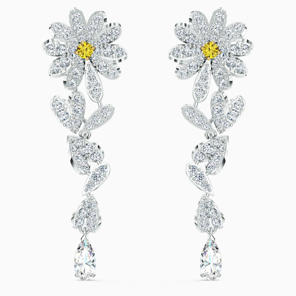 This pair of pierced earrings by Swarovski feature a beautiful design. The studs showcase a daisy on a rhodium-plated setting, with sparkling petals arranged around a yellow stone. Gleaming leaves dangle from each earring, while a single, faceted stone adds an elegant finishing touch. The perfect gift for a special woman in your life.