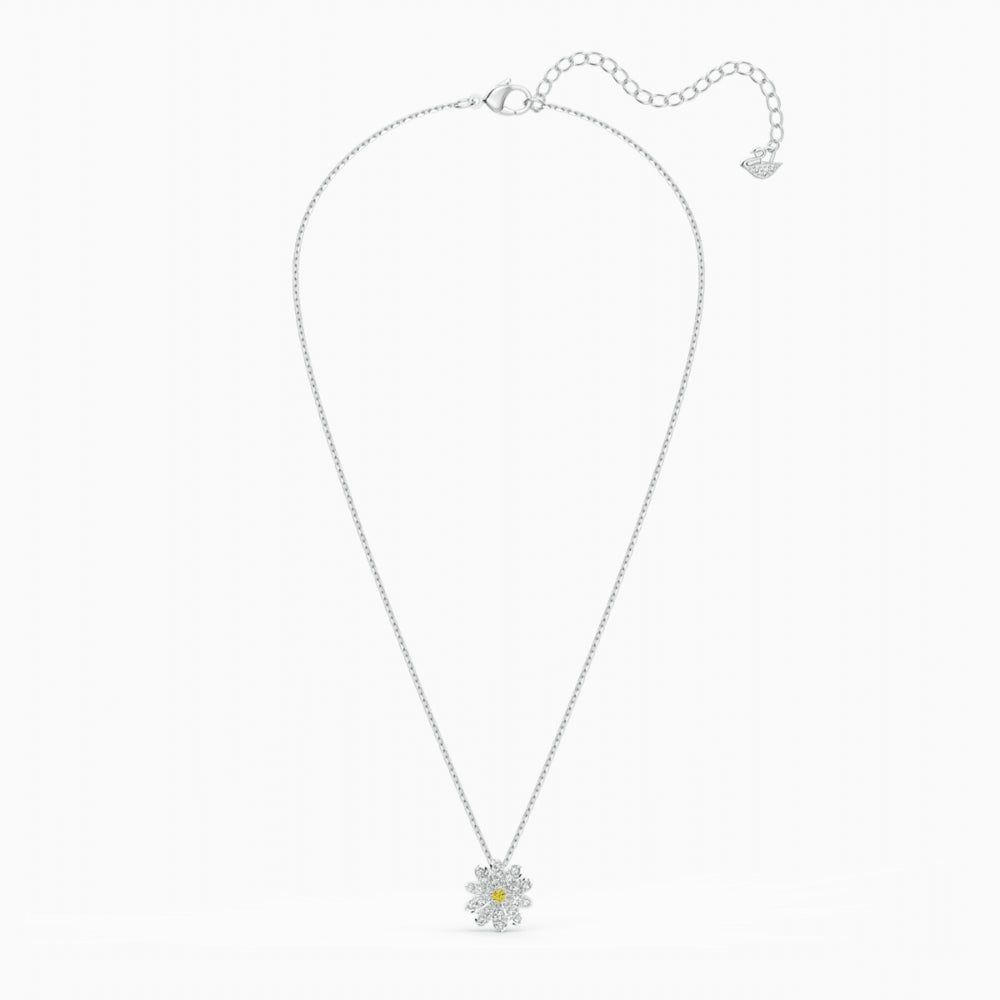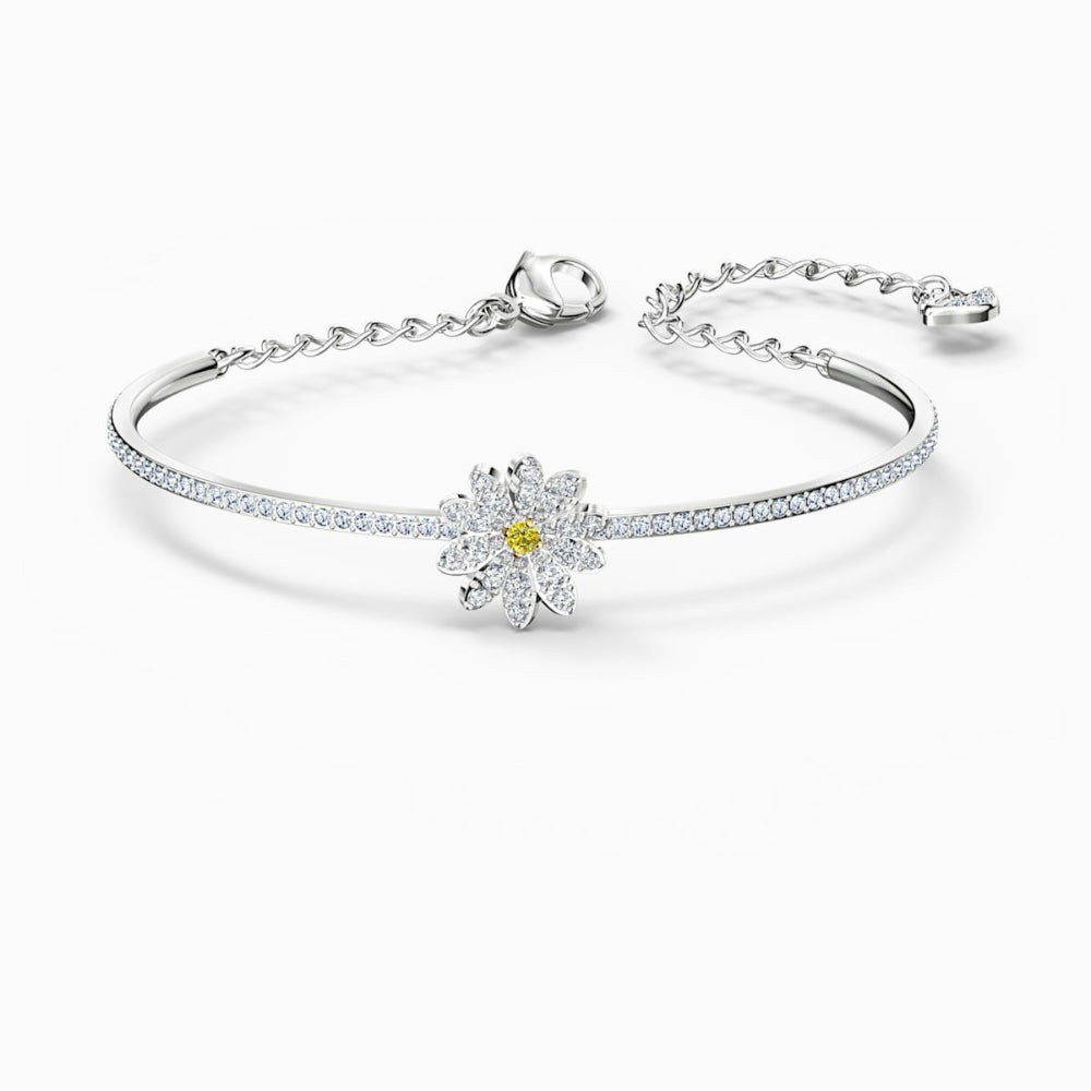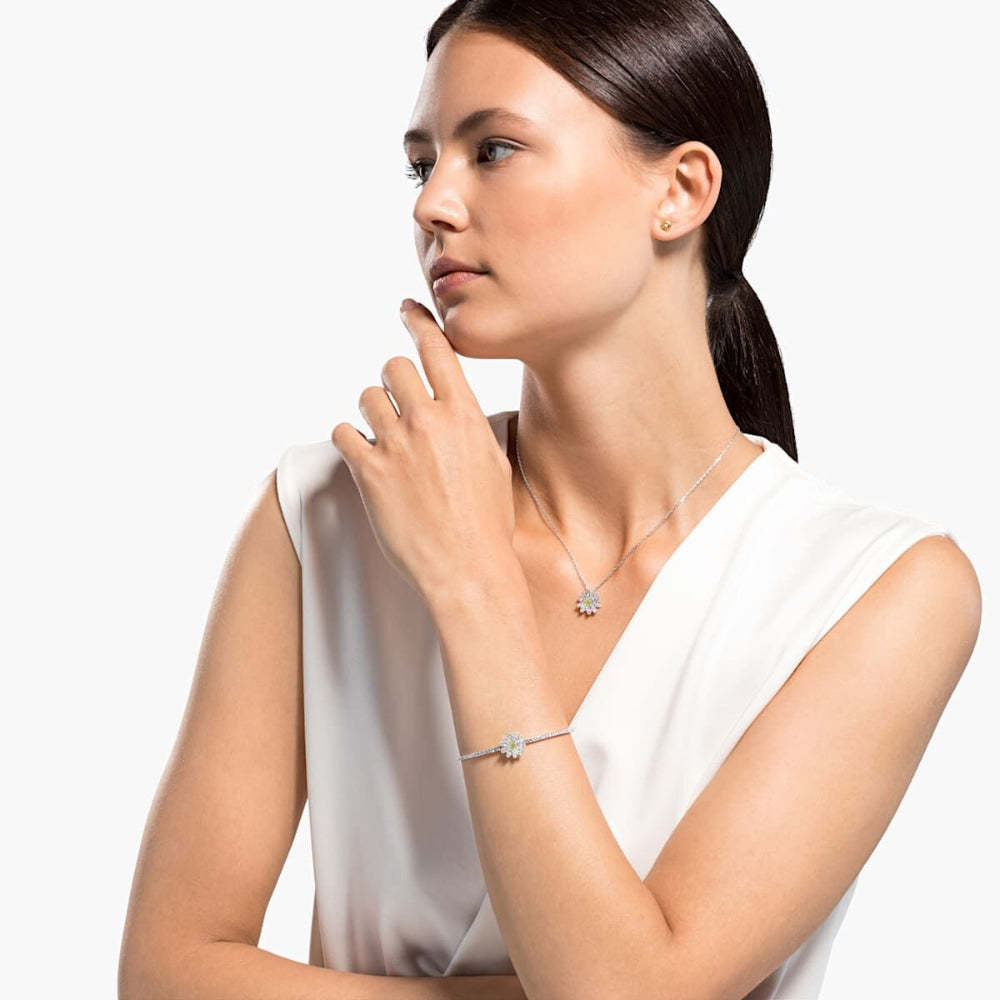 This Swarovski set includes a pair of pierced earrings, a bracelet, and a charming necklace. The central design element of both the necklace and the bracelet is a daisy, showcasing a central yellow stone surrounded by sparkling petals. The daisies' petals are adorned with numerous small, glittering stones. The stud earrings each showcase a faceted yellow stone. This elegant set in a mixed metal finish would make a lovely gift for someone special.