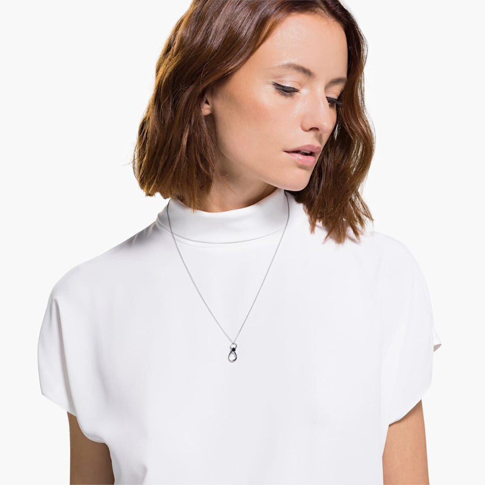 This Swarovski pendant is truly timeless. It features the symbol of infinity with a single, dark stone set at the symbol's junction that contrasts attractively with its rhodium plating. The design's simple elegance makes it suitable for everyday wear as well as casual chic looks. A great gift for both women and men. The pendant comes on a chain.