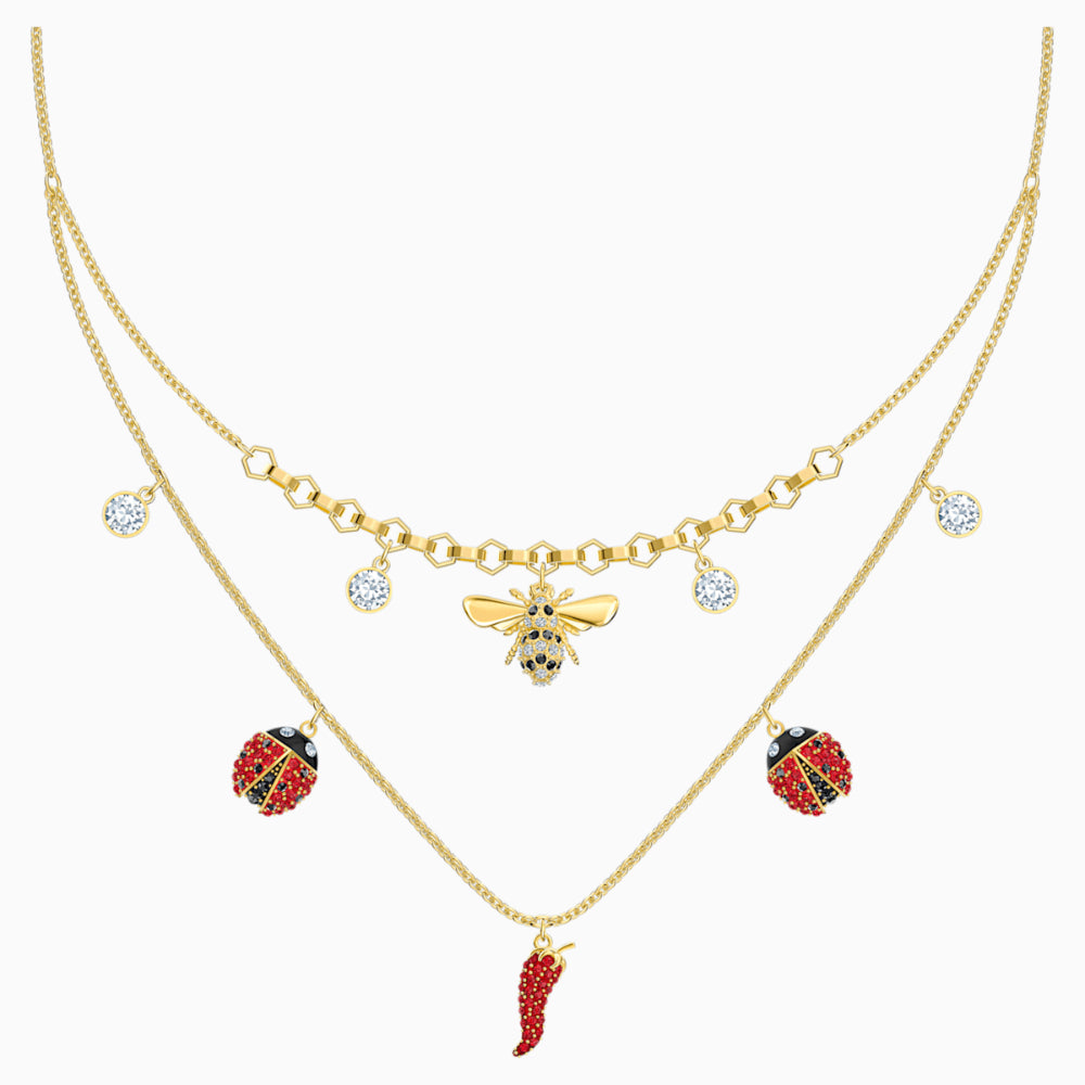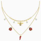 Feel close to nature this fall in this vibrant pre-layered necklace. Featuring an on-trend mix of ladybug, pepper, and bee motifs, this design is packed with lucky symbolism and mysticism. Sparkling with pavé embellishment in red and black, alongside bezel-set crystals in silver tones, it is full of lightness and femininity. A statement in gold-tone plated design. Matching items available.