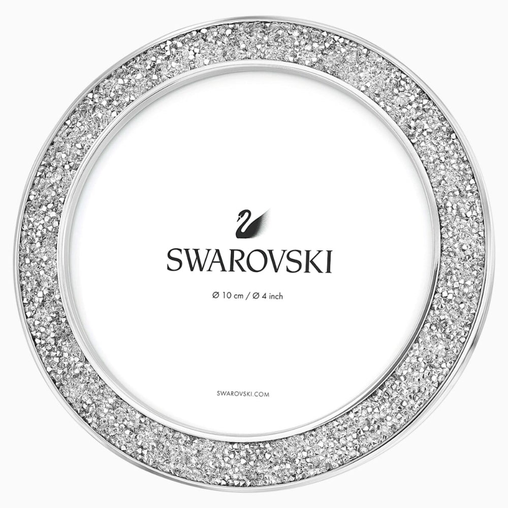 Modern and minimal, this sparkling picture frame has been created in collaboration with internationally renowned Austrian designer Thomas Feichtner. Designed to fit one round photo (diameter: 10 cm/4 inches), it is crafted from die-cast zinc with metal plating, embellished with thousands of tiny crystals in two different colors. It also features a glass front, light grey flocked back and stand, and stainless steel hangers and clips. For the perfect personalized gift, simply add your own special photo or message. Decoration object. Not a toy. Not suitable for children under 15. Size: 13.2 x 13.2 x 6.3 cm