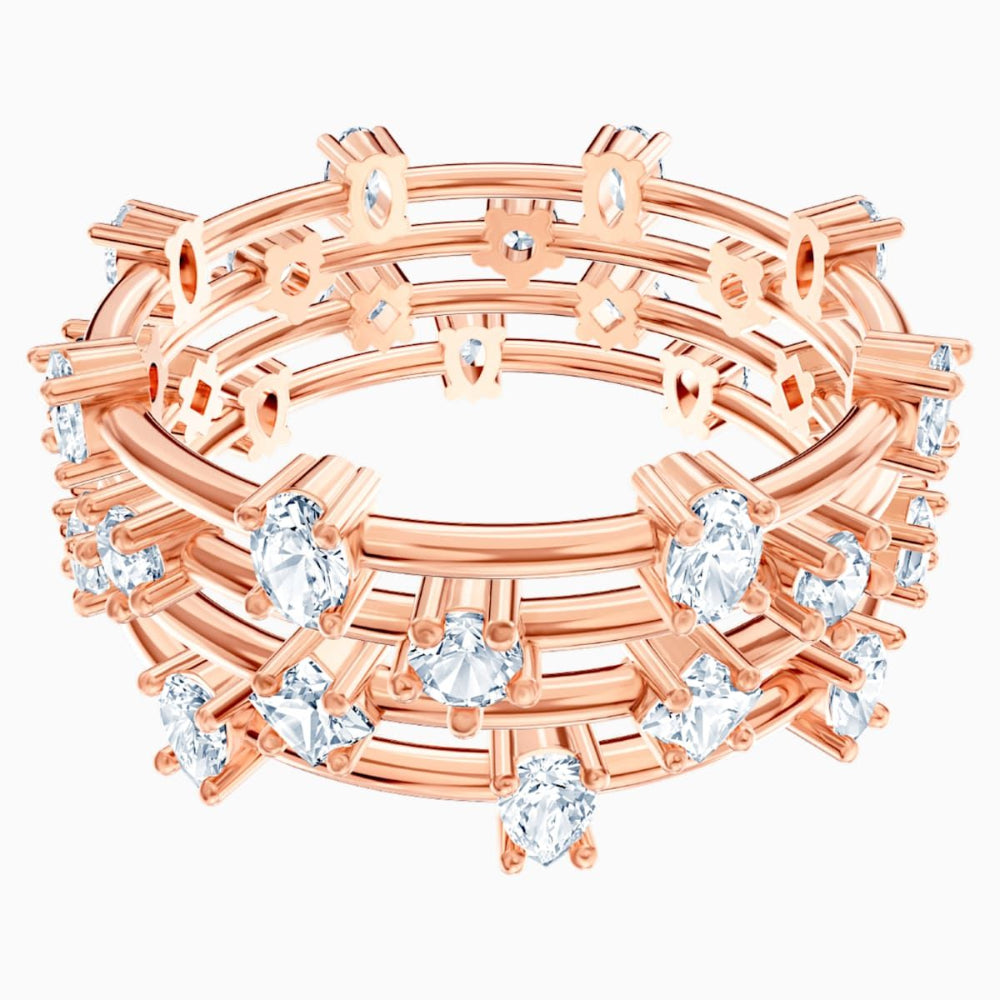 Internationally acclaimed actress Penélope Cruz has extended her collaboration with Atelier Swarovski with her celestial-inspired MoonSun collection, which celebrates the magic of the night sky. Plated in rose gold, the ring features four polished bands studded with white crystals like stars. A modern design, full of Swarovski craftsmanship. The rings can be worn on the same finger, or on different fingers for a unique stacked look