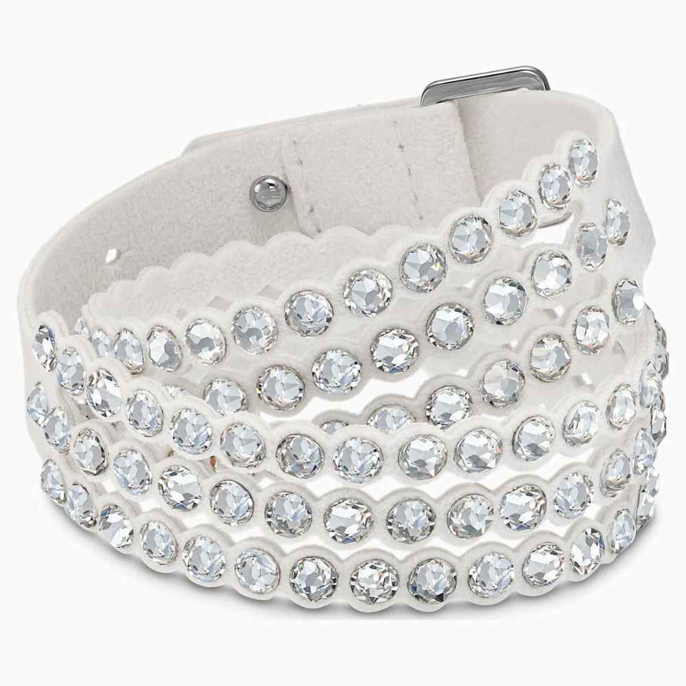 This modern Swarovski bracelet features numerous clear Swarovski crystals on white Alcantara® fabric. The three rows of shimmering crystals wrap elegantly around your wrist for a casual, relaxed look. A buckle in the shape of the Swarovski swan acts as a gorgeous closure for this highly wearable bracelet. A charming piece of jewely to wear from day to night, it would make a great gift for yourself or a loved one.