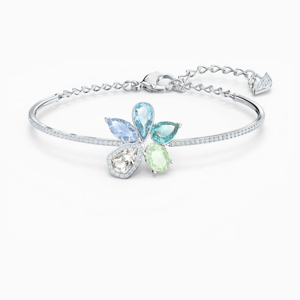 This rhodium-plated bracelet by Swarovski shows a floral design with blue and green crystals, adding a fresh pop of color to your look. Perfect for relaxed days, or elegant evenings that call for a touch of glamour.