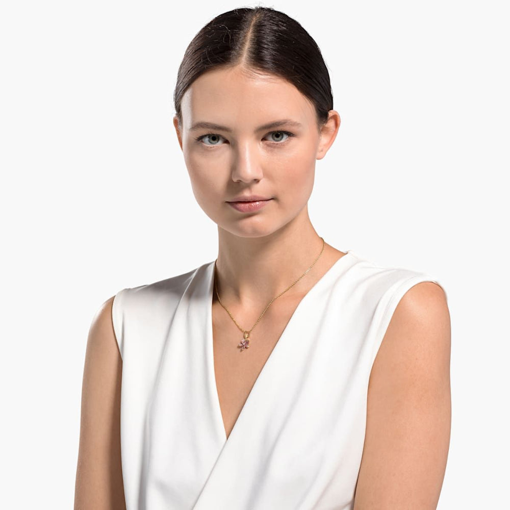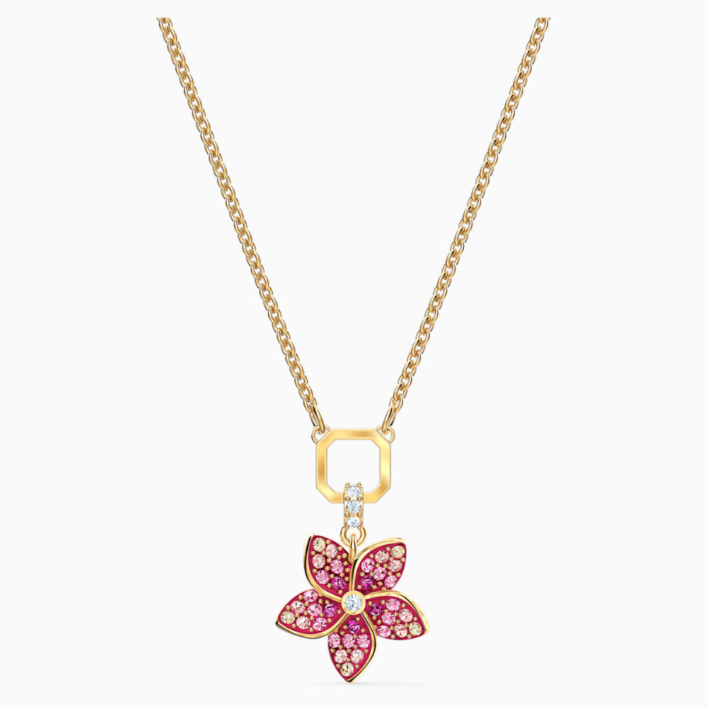 This gold-tone plated Swarovski pendant from our Tropical Collection features an elegant central element. The coral-colored blossom is embellished with crystals for a glamorous look. Ideal for brightening up a casual outfit, and a great gift for flower lovers. The pendant comes on a chain.