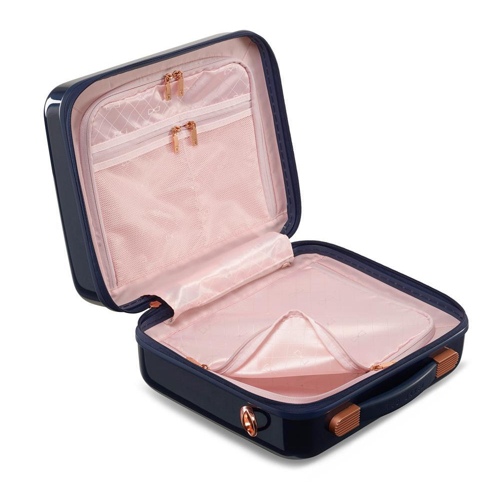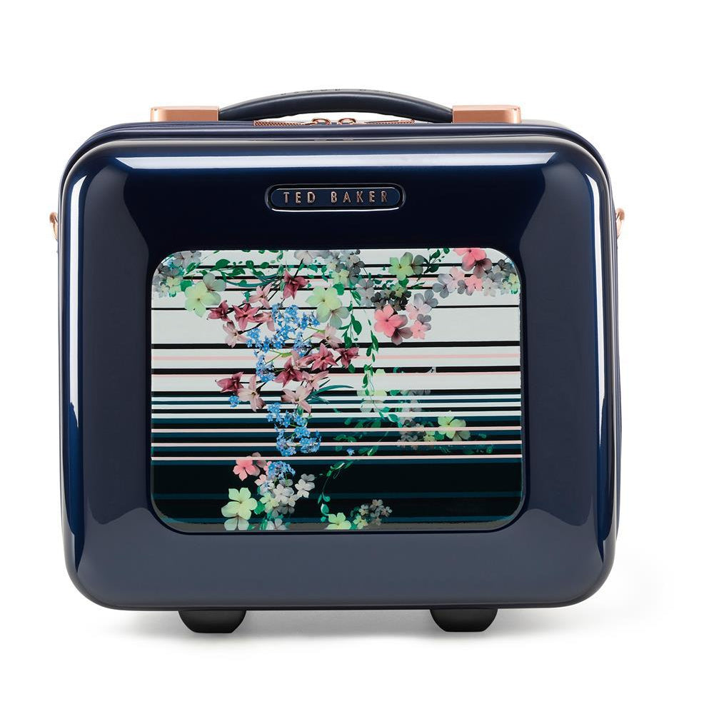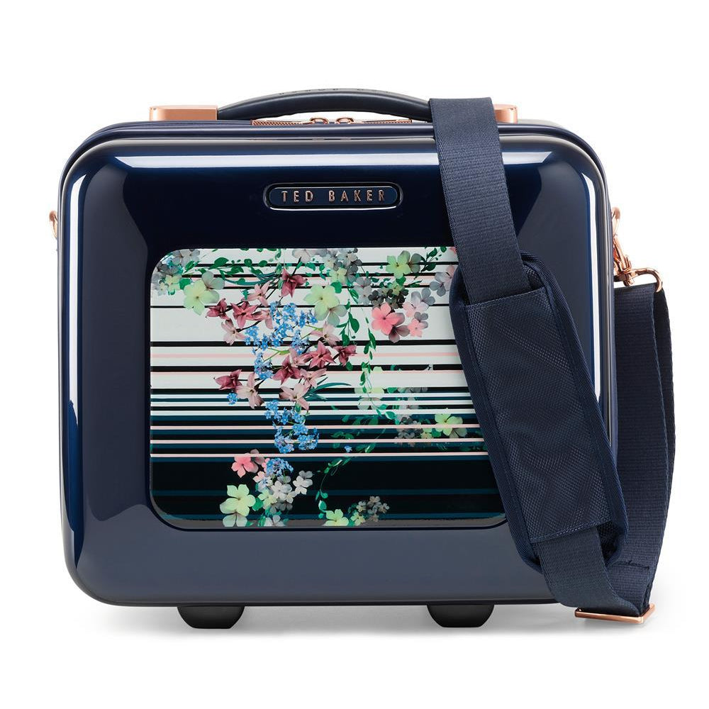 The Ted Baker Take Flight Pergola Stripe Cosmetic Case Vanity Dark Blue is the perfect addition to your vanity. Its sleek design is crafted with lightweight hard-shell construction making it easy to carry and store in your luggage. The vanity case features a two-way zip-around closure, top carry handle, removable padded shoulder strap and back strap for adding to roller bag handle (roller bag sold separately). Inside, you'll find two interior compartments, zip and mesh pockets along with a logo-jacquard lining that adds to the luxury of this piece. Whether you're going on vacation or just reorganizing your vanity, the Ted Baker Take Flight Pergola Stripe Cosmetic Case Vanity Dark Blue is perfect for any glamour girl. SPECIFICATIONS: