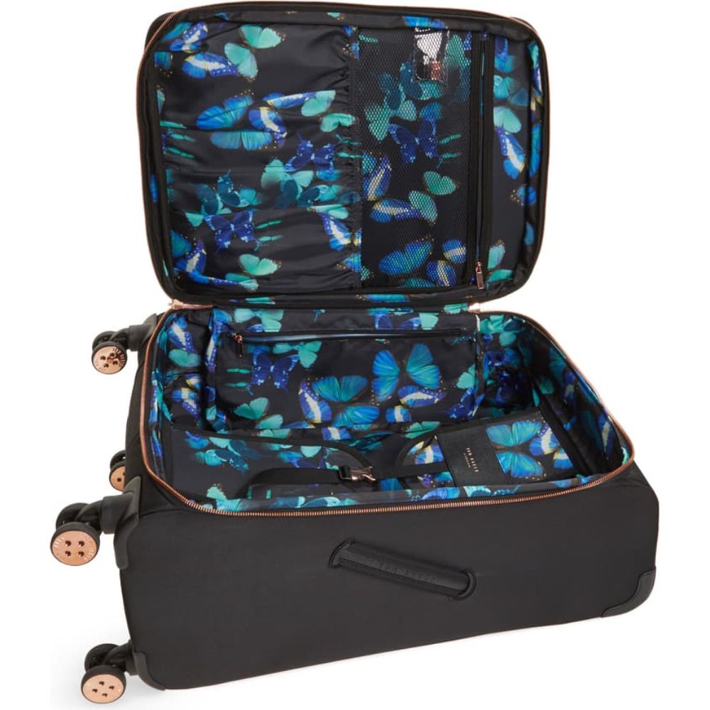 branded anchor points and the button style Ted Baker hub caps with ultra smooth double rolling wheels. Albany also includes the new foiled rose gold embossed logo so everyone knows you’re carrying one of Teds’ creations.