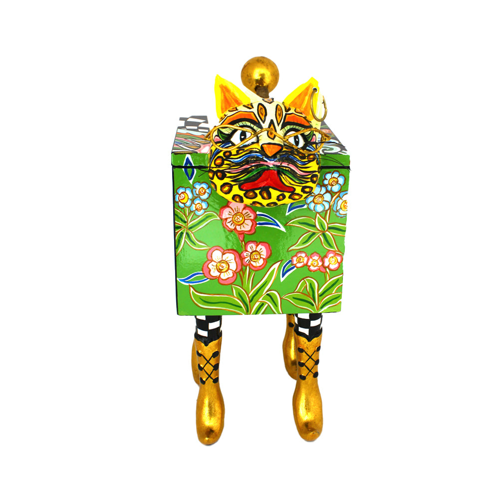 The different designed cat figures from toms drag collection are colorful and humorously designed. Caddy cat is a handy storage box for example for, jewelry. A perfect gift for the cat owner. The cat has real whiskers, a flexible tail and golden boots. Under the lid is a practical storage space for trifles. Completely handmade of wood and marmorin.