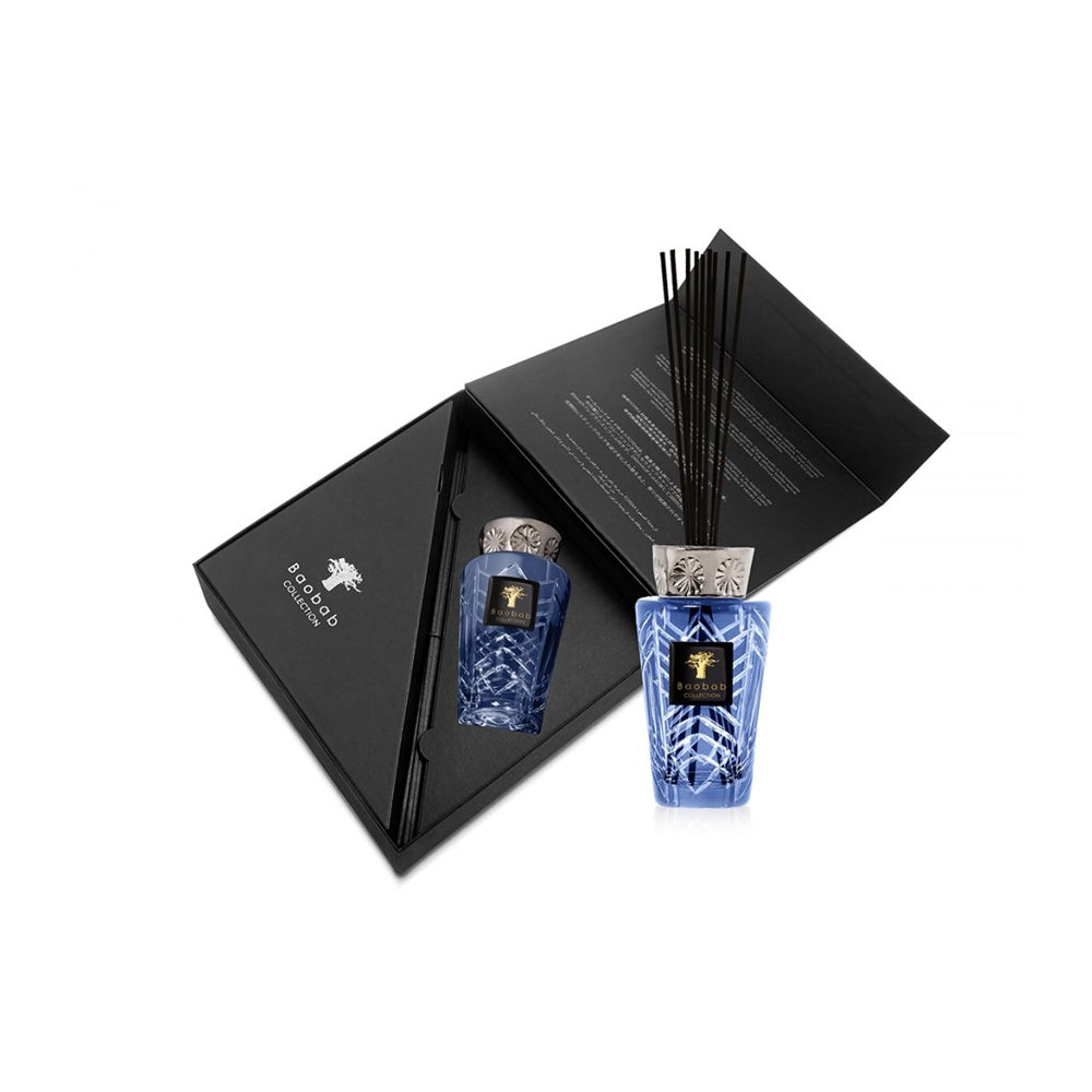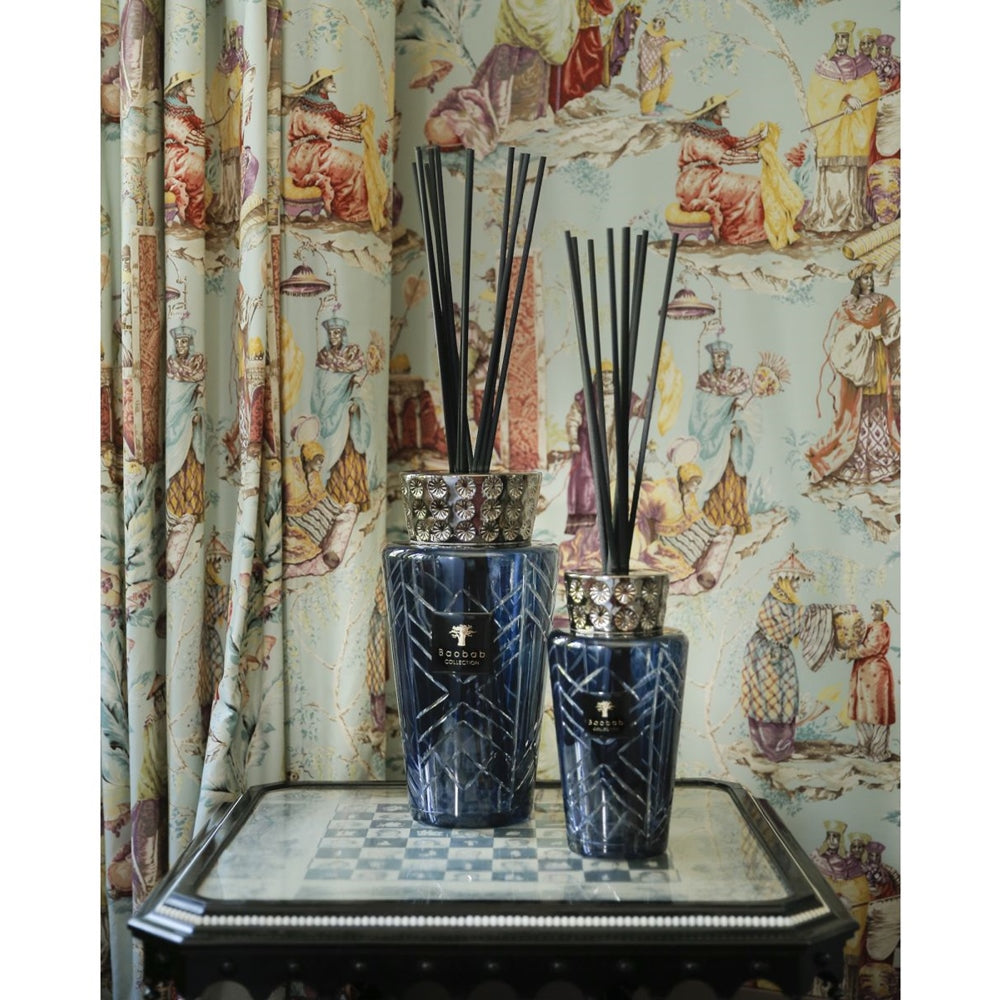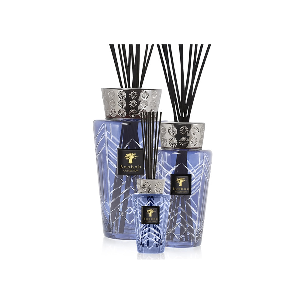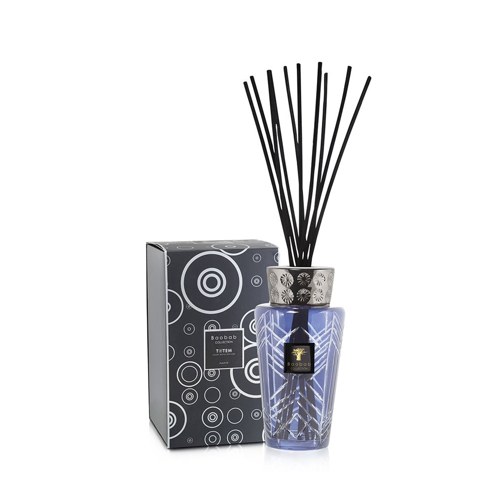 The Totem Swann fragrance diffusers come in large hand-blown blue flasks, hand-engraved with a graphic motif. Available in 5 liters (169 fl oz), 2 liters (67 fl oz), and Mini Totem (8.4 fl oz). They are magnificent objects of decoration and absolutely timeless. They enchant your interiors with their delicate perfume of iris, cedarwood, and vetiver.