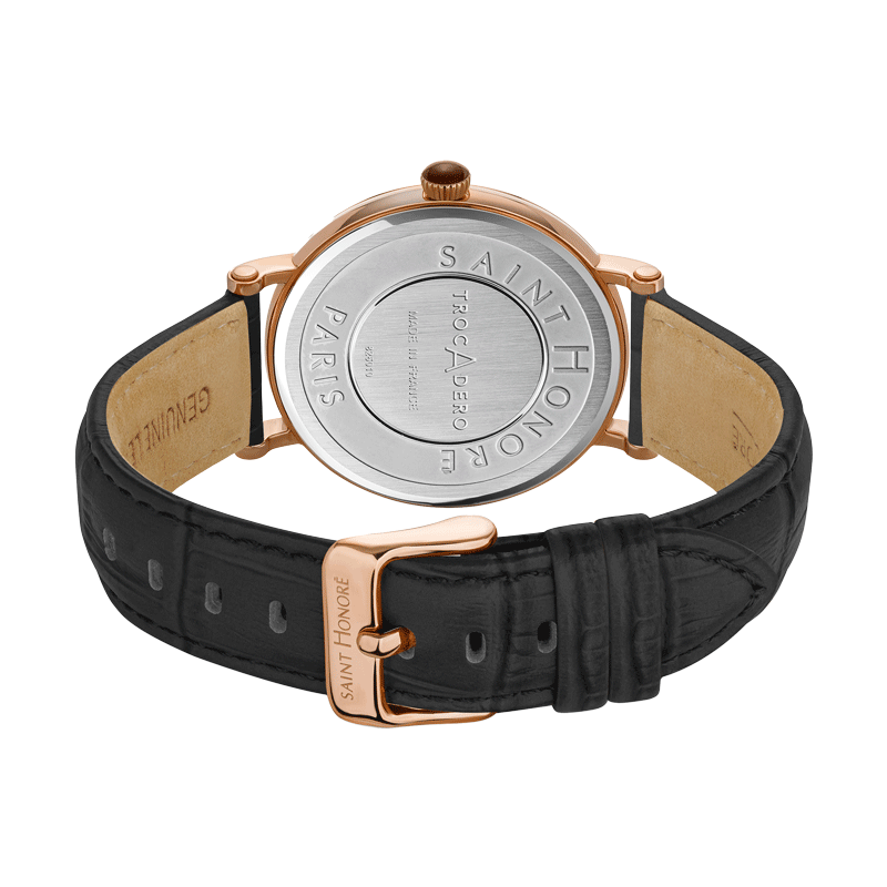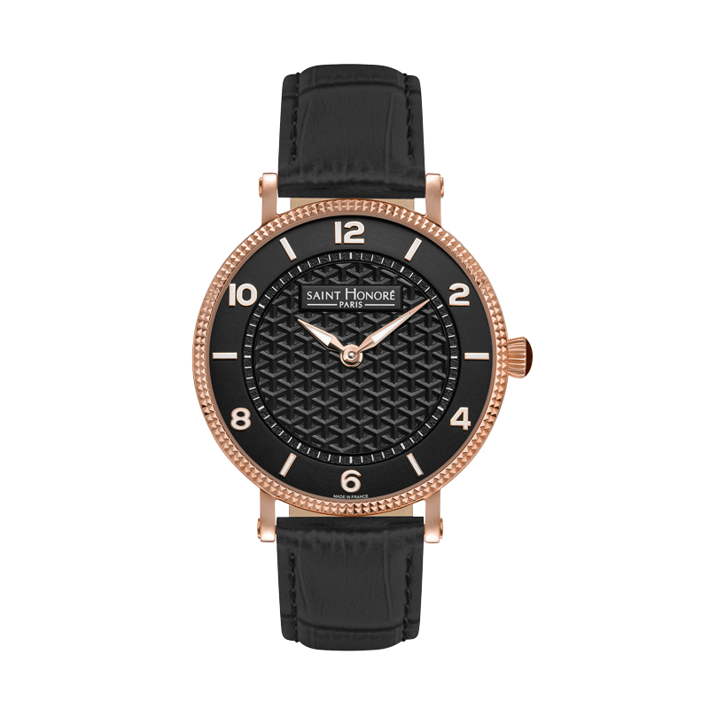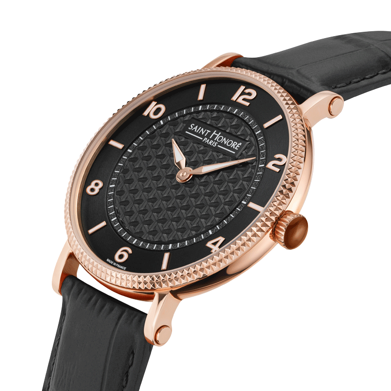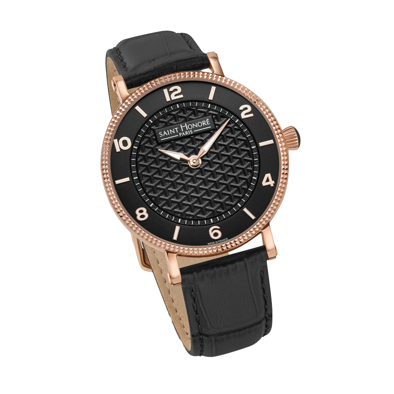 Getting its name from the famous Parisian neighbourhood overlooking the Eiffel Tower, the Trocadéro’s design was the brand’s inspiration. SAINT HONORÉ endeavoured to perfect each element of the watch by adorning the bezel with a “clous de Paris” decoration in a very accomplished two-row arrangement. With the deceptive simplicity of a two-handed movement, Trocadéro is exceedingly easy to read and reveals exquisite finishes: guilloché dials, Roman numerals, “sword” hands and a chiseled crown adorned with a black cabochon.