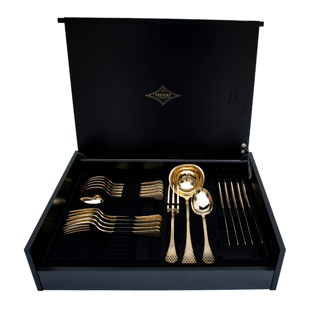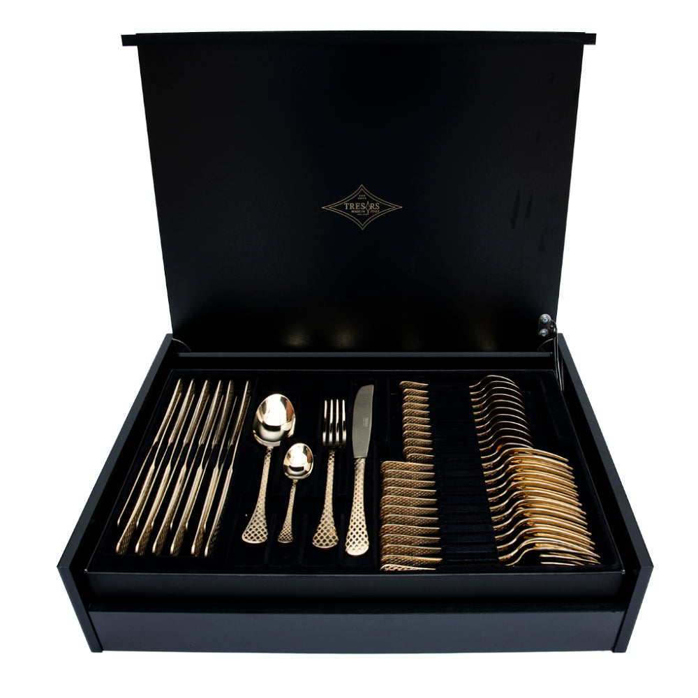 Tresors Gocce Full Gold Cutlery Set 75 Pcs 18/10 Wood Box