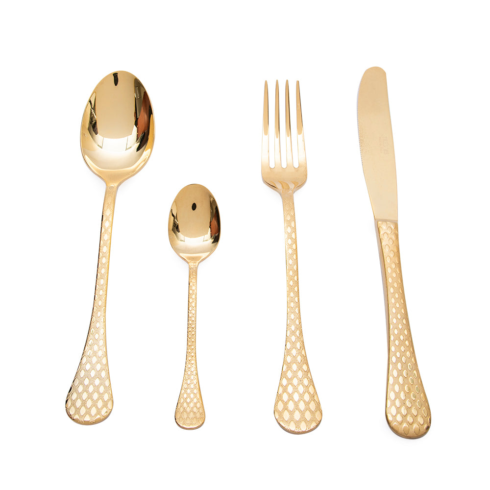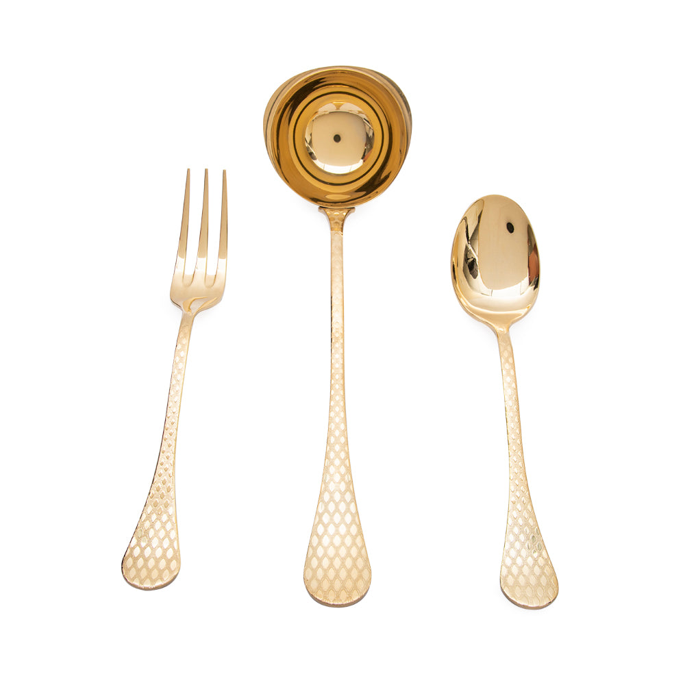 The Tresors Gocce Full Gold Cutlery Set is a stunning set of dinner cutlery crafted from durable 18/10 stainless steel and finished with a full gold plating. The perfect addition to your dining table, this 75 piece set offers everything you need for all your entertaining needs. Each piece is shaped to fit perfectly in your hand and with its unique design and elegant finish, it gives your dining experience a luxurious touch. The pieces come packed in a wood box that ensures the set stays neat and organized. The Gold plating gives a special touch to your meal, and the pieces also can be used for special occasions or just to add a touch of sophistication to any dinner table. The intricate orientation of each piece creating a fantastic presentation wherever they are used. This set is made to last and sure to add style to any meal. SPECIFICATIONS