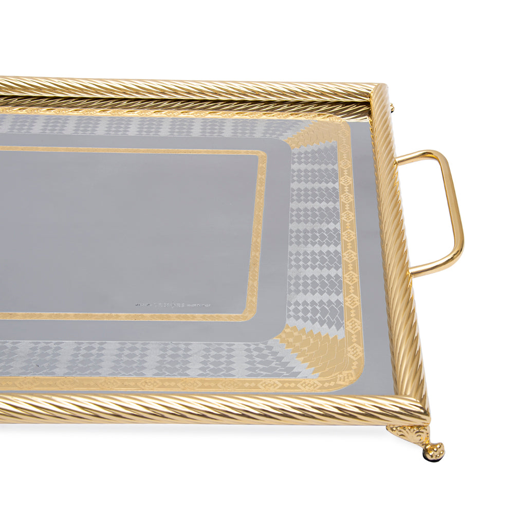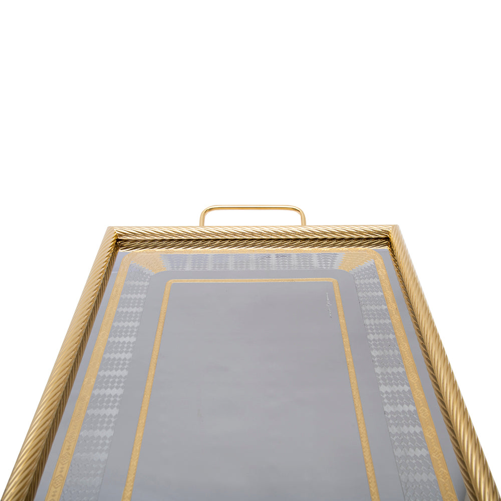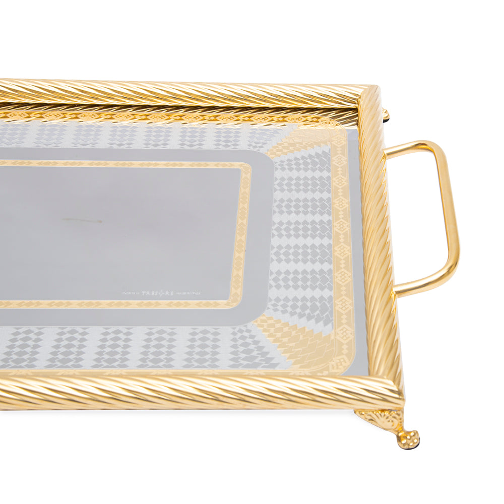 The Tresors Light Gold Rectangular Tray is the perfect piece for adding a touch of luxury to your dining experience. This exquisite Italian tray is crafted with 18/10 stainless steel, Silver and Gold plating, and is available in a variety of sizes, shapes, and designs. Whether you are hosting a dinner party or simply serving snacks to your guests, this tray will most certainly make an impressive impression. The luxurious gold plating adds a sparkling shine, while the lustrous silver gives off a classic and stylish air. The tray also has a convenient holding handle, making it an excellent choice for passing items around a gathering. Not only does this piece look stunning on your table, but it is also easy to clean and maintain. Its construction is extremely high-quality, brandishing a robust and durable form to provide reliable service for years to come. The Tresors Light Gold Rectangular Tray is the perfect choice for elevating your entertaining experience with its classic style and modern design. SPECIFICATIONS