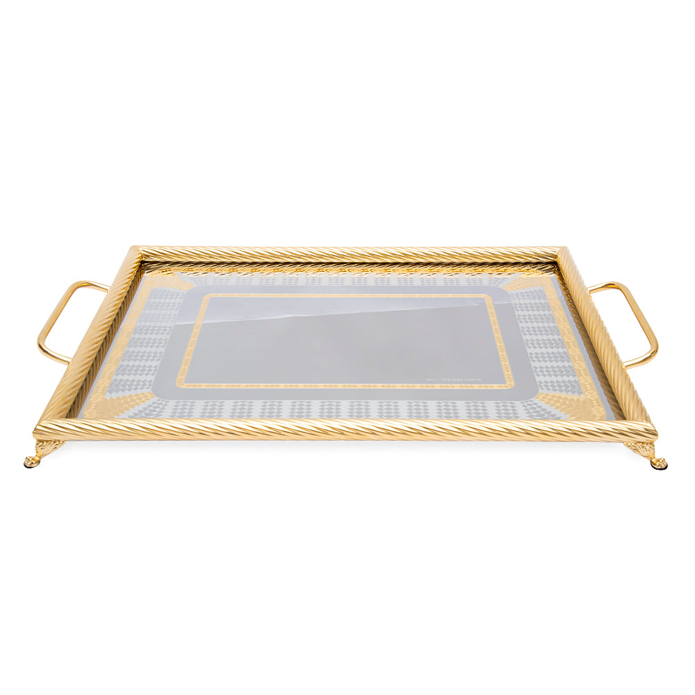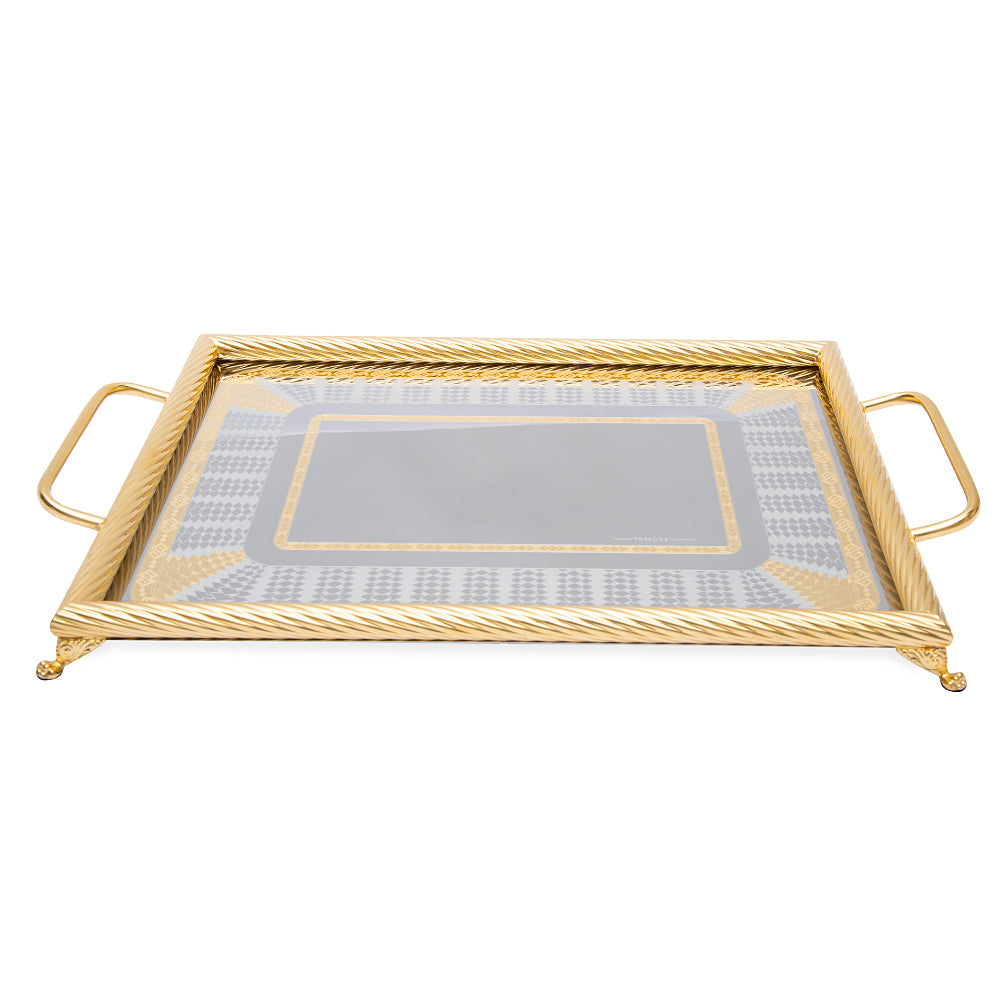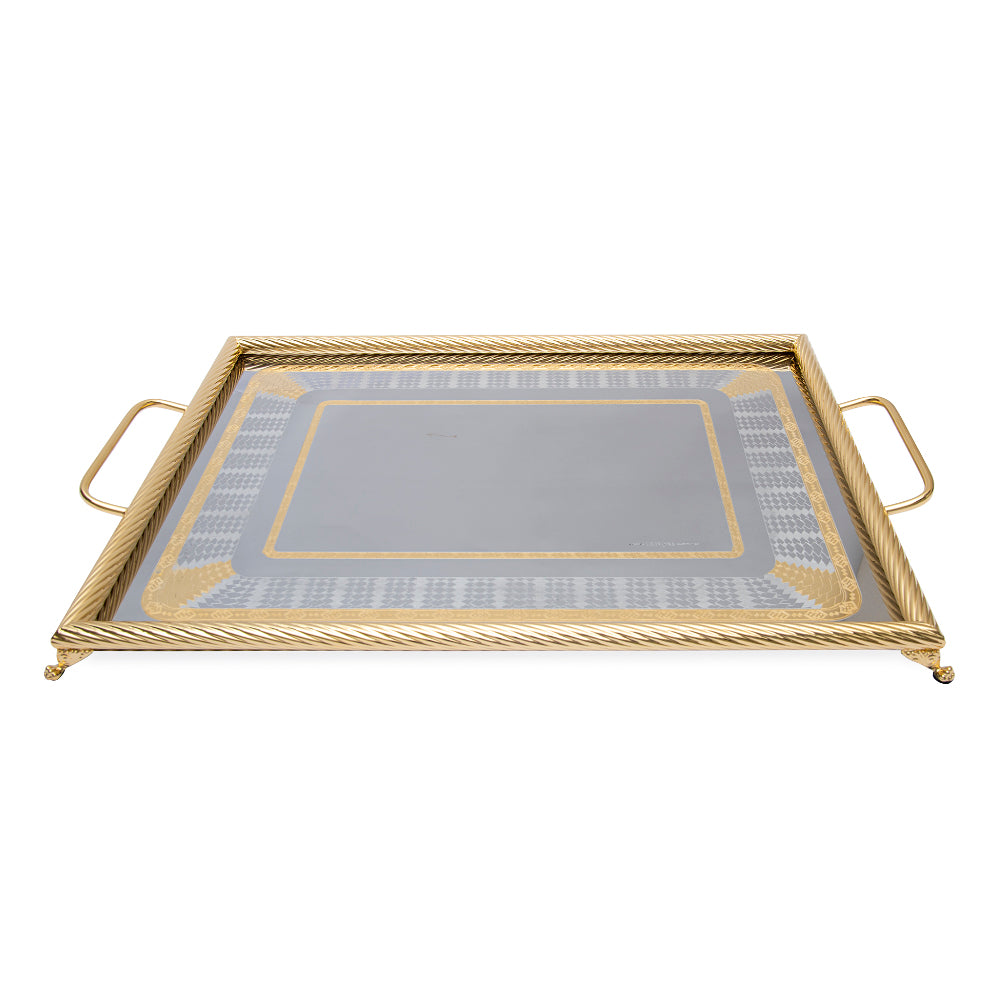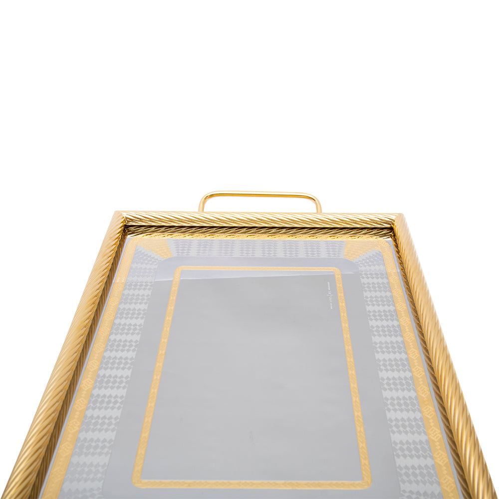 The Tresors Light Gold Rectangular Tray is the perfect piece for adding a touch of luxury to your dining experience. This exquisite Italian tray is crafted with 18/10 stainless steel, Silver and Gold plating, and is available in a variety of sizes, shapes, and designs. Whether you are hosting a dinner party or simply serving snacks to your guests, this tray will most certainly make an impressive impression. The luxurious gold plating adds a sparkling shine, while the lustrous silver gives off a classic and stylish air. The tray also has a convenient holding handle, making it an excellent choice for passing items around a gathering. Not only does this piece look stunning on your table, but it is also easy to clean and maintain. Its construction is extremely high-quality, brandishing a robust and durable form to provide reliable service for years to come. The Tresors Light Gold Rectangular Tray is the perfect choice for elevating your entertaining experience with its classic style and modern design. SPECIFICATIONS
