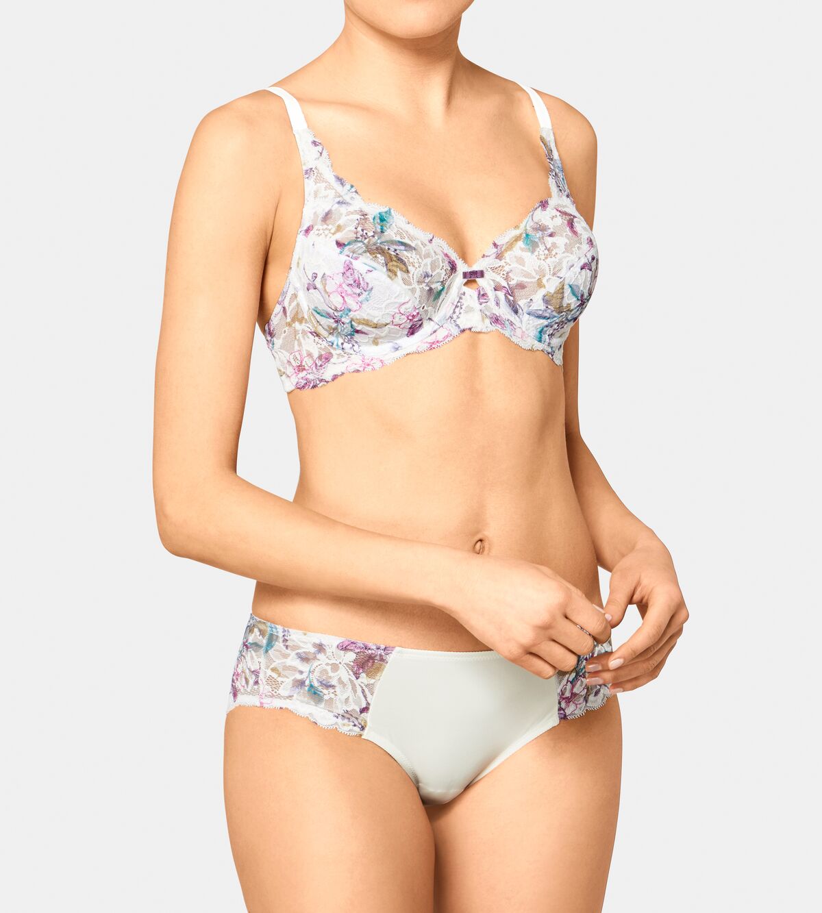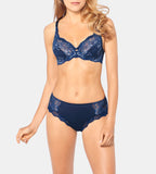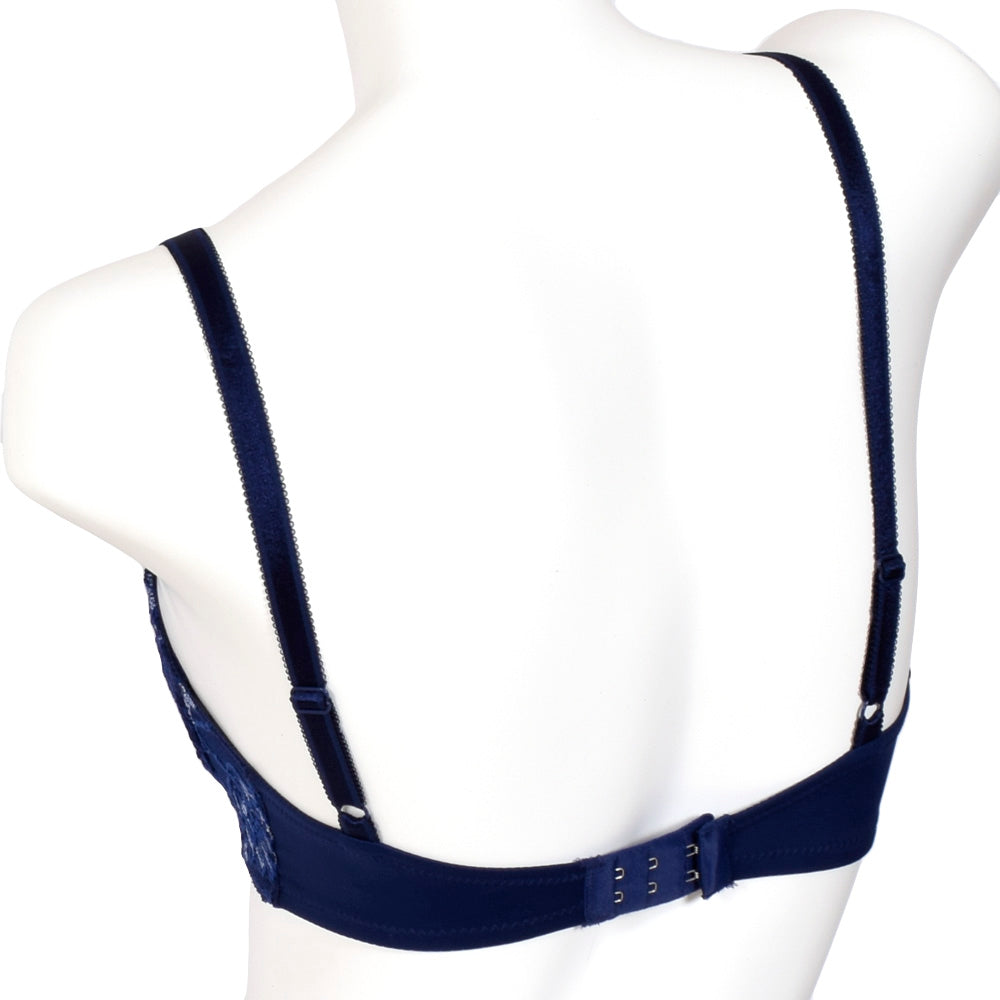All over lacy bra featuring wired cups with additional, soft lining on the lower cup. It has smooth trimmings and wider lace straps in front for support and comfortable wearing. A super soft, comfortable hook and eye, three times adjustable at the back which is made of smooth jersey fabric. Adorned with little sateen bow at centre front for finishing touch.