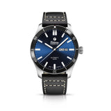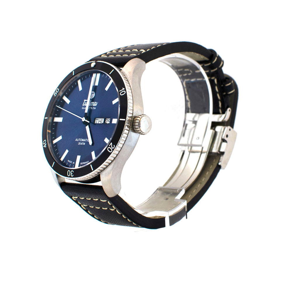 Grand flieger airport cal.Tutima 330 automatic movement 38 hours power reserve,43mm case size 25 jewels with day and date calendar,leather strap and solid stainless steel case,black bidirectionally rotating bezel,screw down crown and skeleton case back,sapphire crystal on front and back,water resistance 200mm/660ft/20atm,blue/black dial with luminous hour marker/dots