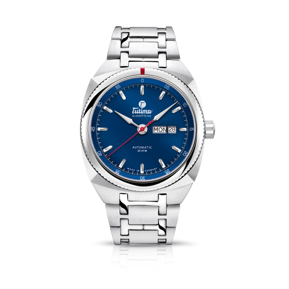 Saxon one cal.Tutima 330 automatic movement 38 hours power reserve,42mm case size 25 jewels with day and date calendar,solid stainless steel case and bracelet with the three dimensional,pyramid shape design,smooth bidirectionally rotating bezel,screw down crown and skeleton case back,sapphire crystal on front and back,water resistance 200mm/660ft/20atm,blue dial with luminous hand,warranty for 2 years.