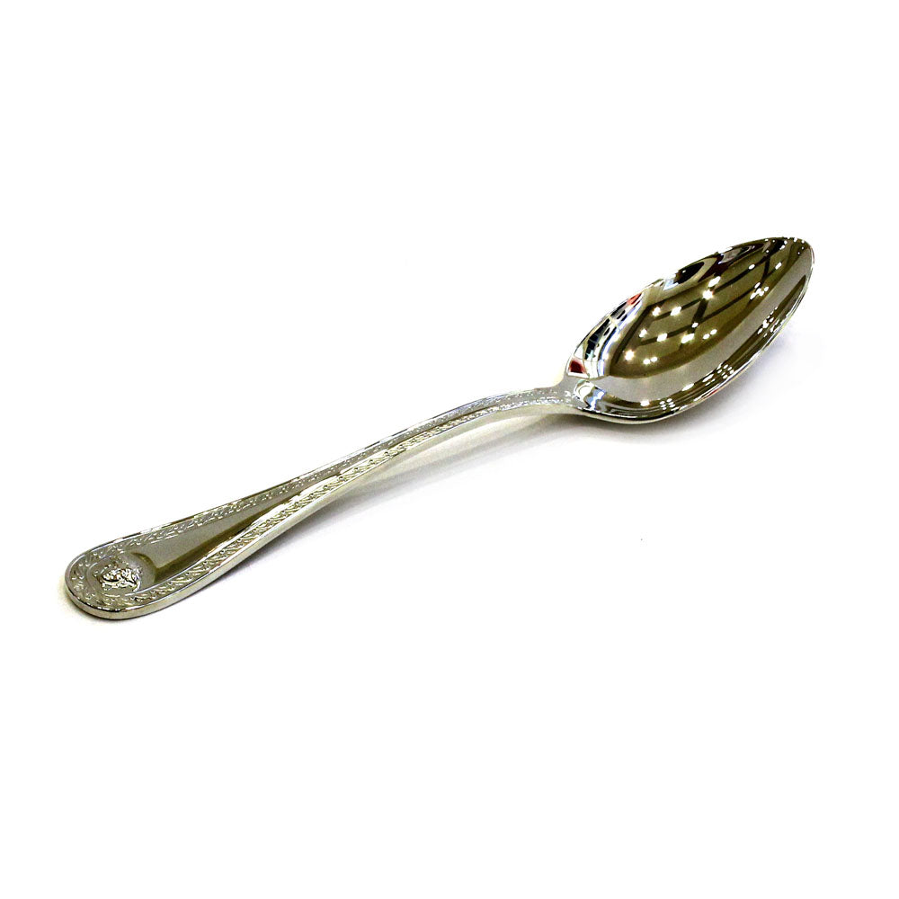 The Versace Dinner Spoon is a luxurious and elegant addition to any dining experience. Made by the world-renowned fashion and lifestyle brand Versace, this dinner spoon features a beautiful etched border and the iconic Medusa motif that is synonymous with the brand. With its stunning silver finish, this spoon adds a touch of opulence to any table setting. Whether used for special occasions or everyday meals, the Versace Dinner Spoon is sure to impress with its eye-catching design and high-quality craftsmanship. It is perfect for enjoying soups, stews, and other dishes that require a larger, deeper spoon. However, it is important to note that this dinner spoon is not dishwasher safe and should only be hand washed in order to preserve its intricate details and silver finish. The Versace Dinner Spoon is a striking and luxurious piece of cutlery that is perfect for adding a touch of glamour to your dining experience. Its exquisite design and attention to detail make it a standout piece that is both functional and a work of art. SPECIFICATIONS