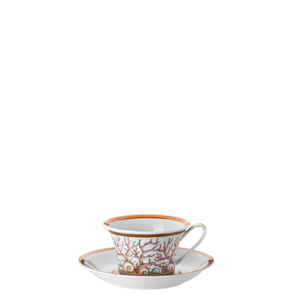 This wonderful Versace dinnerware is called Etoiles de la Mer. It is produced using the finest porcelain creating a style that is best described as luxurious and glamorous. The most prominent color of this item is white. Playful floral decorations make this piece an eye catcher on every table or countertop. The tea cup & saucer is sold as a set of 6.
