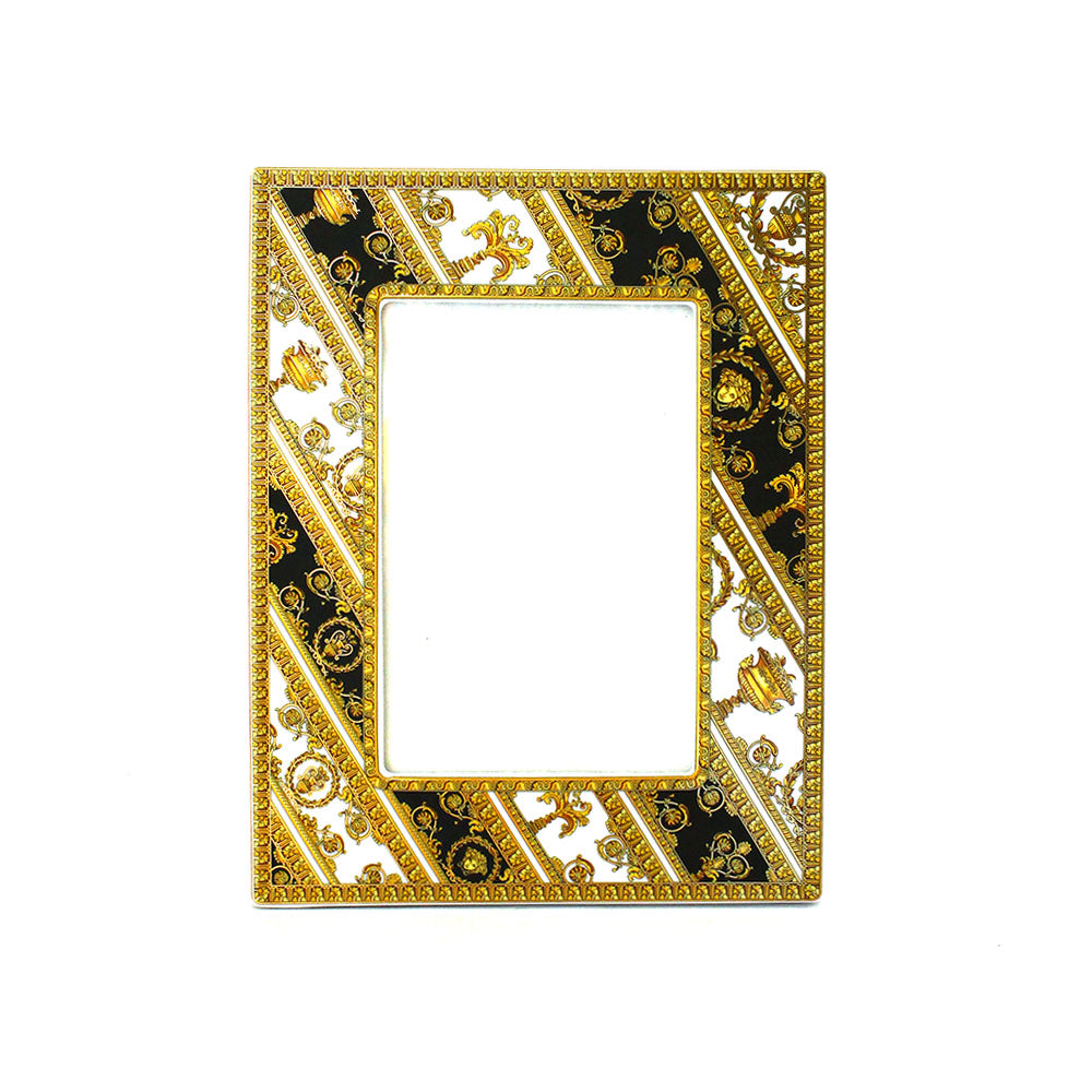 This wonderful versace giftware is called I love baroque. It is produced using the finest porcelain creating a style that is best described as luxurious and glamorous. The picture frame measures 23x18 cm. The most prominent color of this item is gold. Lavish ornaments decorate this piece and make it a 'must have' for everyone in love with opolent design. The legacy of versace and its fascination for glorious epochs is still opulent yet renewed in a pure style, making the new “i love baroque” collection unseasonal and timeless. The gold medusa draws the eye to the centre of the plate while recurrent neoclassic symbols interchange in geometric circle bands. Signature of the baroque print, urns, laurels and ornaments stand out on a matt black or white background, all enriched with gold.