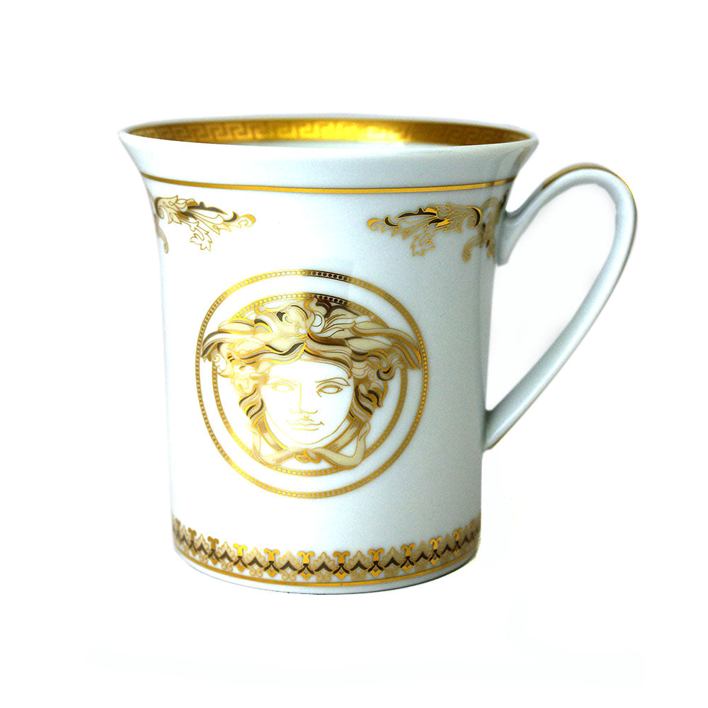 Medusa gala is a new luxurious and elaborately decorated tableware range that complements the glamorous versace lifestyle line. Inspired by the ambience of opulent dinner parties, the design replicates the traditional versace motifs: the iconic medusa head and intricate baroque ornaments adding an exciting contrast of white and gold to create a contemporary table arrangement. The medusa gala gold line, adorned with a full-faced gold plume and ribbon motif, is even more luxurious. This wonderful versace dinnerware is called medusa gala gold. It is produced using the finest porcelain creating a style that is best described as luxurious and glamorous. The mug can hold up to 11 oz. Of liquids. The most prominent color of this item is gold. Lavish ornaments decorate this piece and make it a 'must have' for everyone in love with opulent design.