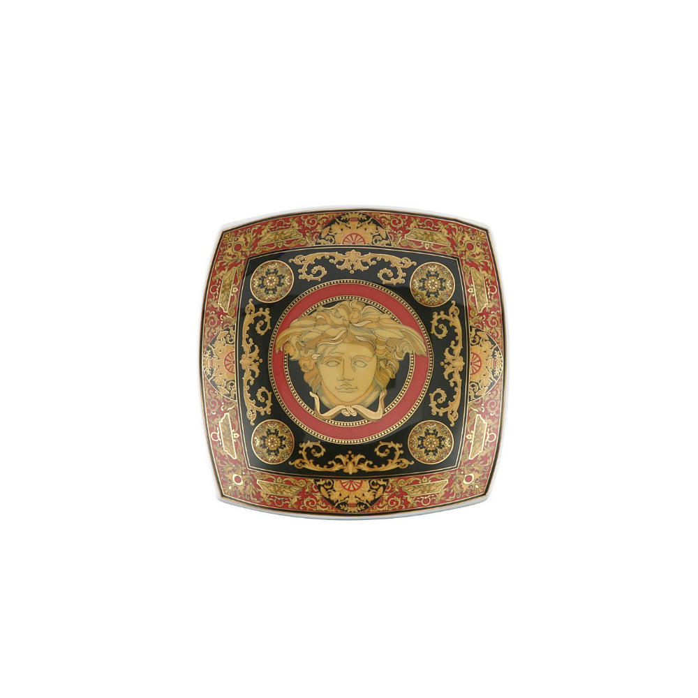 This remarkable Versace giftware is called Medusa Red. It is produced using the finest porcelain creating a style that is best described as luxurious and glamorous. The candy dish measures 5 1/2 inch. The most prominent color of this item is red. Lavish ornaments decorate this piece and make it a 'must have' for everyone in love with opulent design.