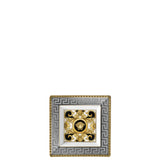 This beautiful Versace dinnerware is called Prestige Gala. It is produced using the finest porcelain creating a style that is best described as luxurious and glamorous. The tray measures 5 1/2 inch. The most prominent color of this item is gold. Lavish ornaments decorate this piece and make it a 'must have' for everyone in love with opulent design.