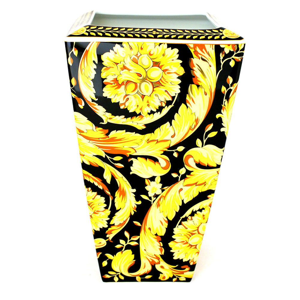 This fascinating versace giftware is called vanity. It is produced using the finest porcelain creating a style that is best described as luxurious and glamorous. The vase measures 12 1/2 inch. The most prominent color of this item is gold. Playful floral decorations make this piece an eye catcher on every table. Vanity is the most famous motive and an original draft by the legendary gianni versace. What is already successful in fashion and the area of home collection, is transferred to precious porcelain. The new series "vanity” from the design "ikarus” is a must-have for all lovers of the typical versace opulence. The décor is brought to live with the typical baroque color combination of dark blue and gold tones on a set and also on exclusive gift accessories like vases and dishes. It reminds of precious inlays on baroque furniture.