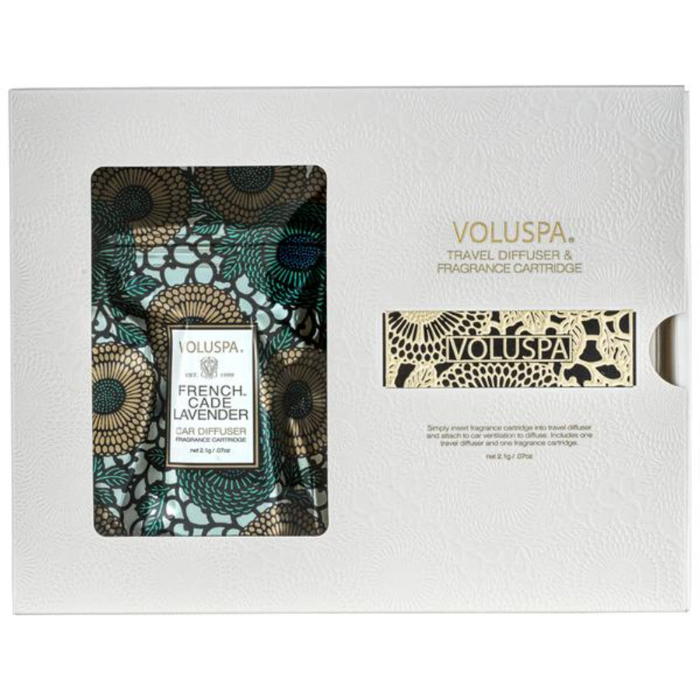 Voluspa's iconic Japonica pattern is precision-cut out of stainless steel and plated with an elegant gold finish. The Voluspa travel diffuser employs a cold-diffusion system to effectively and efficiently release fragrance.