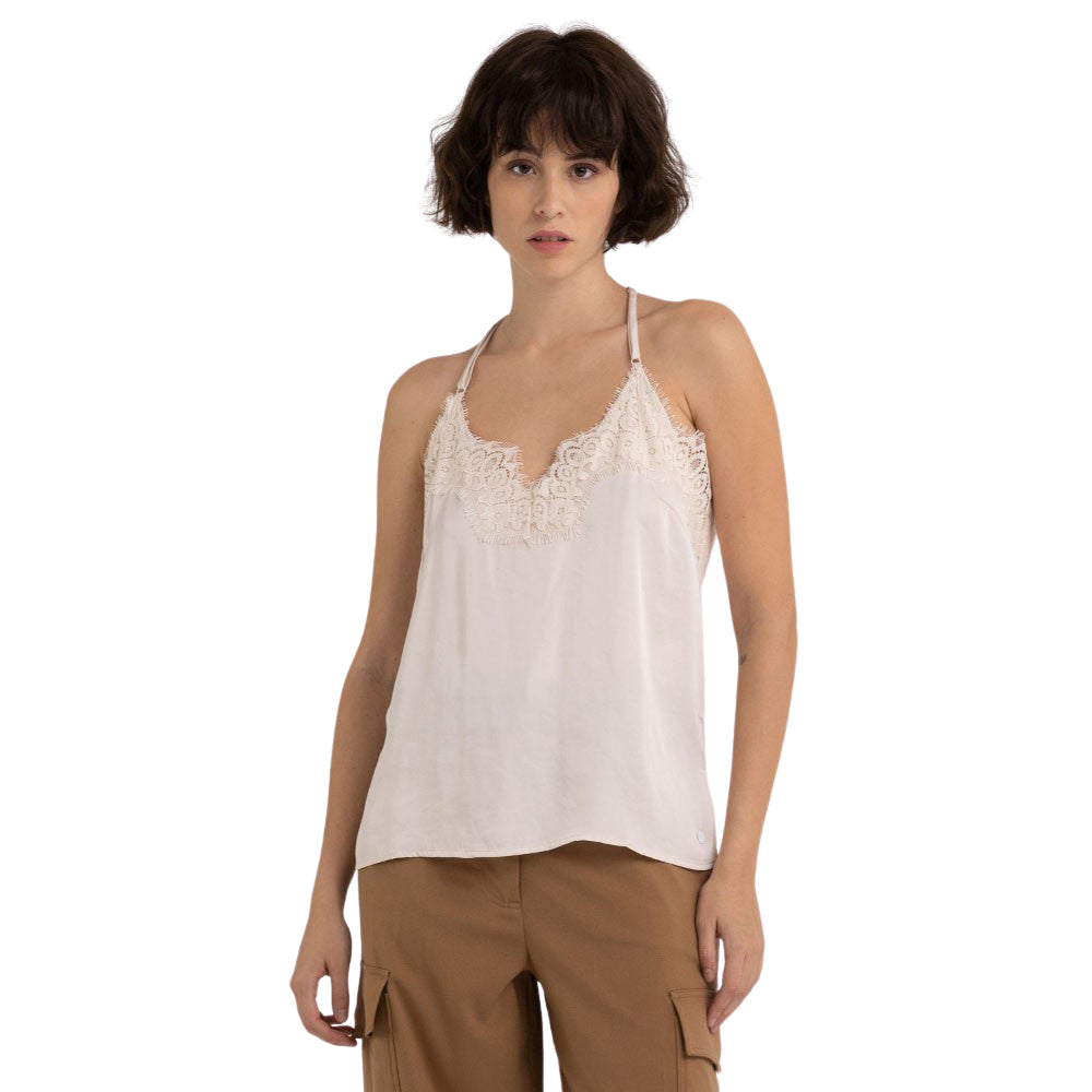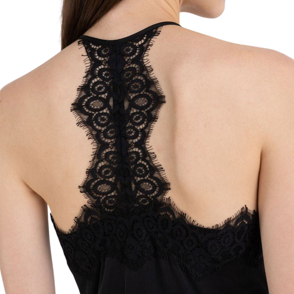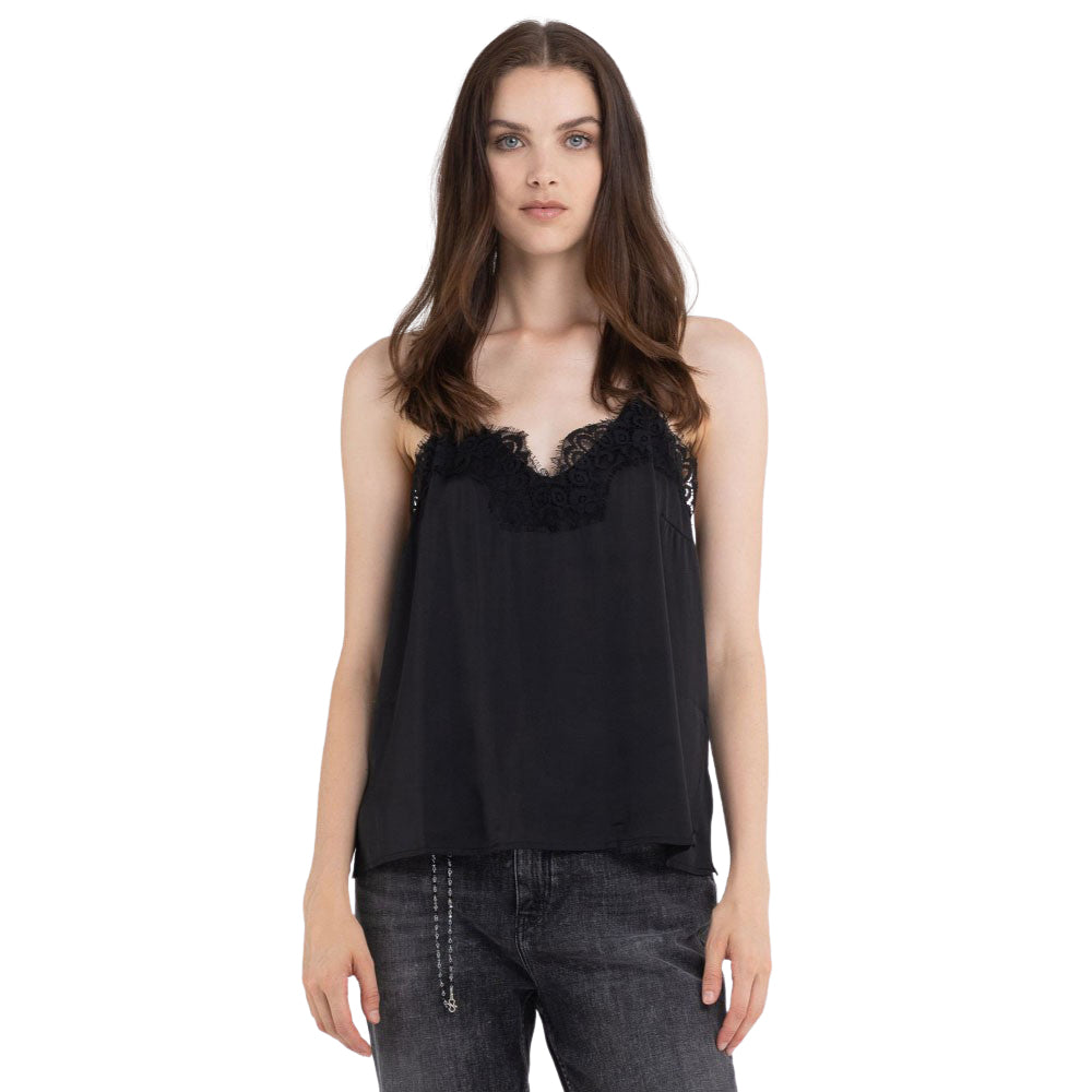 Sleeveless top made of light viscose blend fabric. With adjustable thin shoulder straps, the garment is refined by the contrasting-coloured lace edges on the collar and at the back. With straight fit, the item features two small side slits at the hem.
