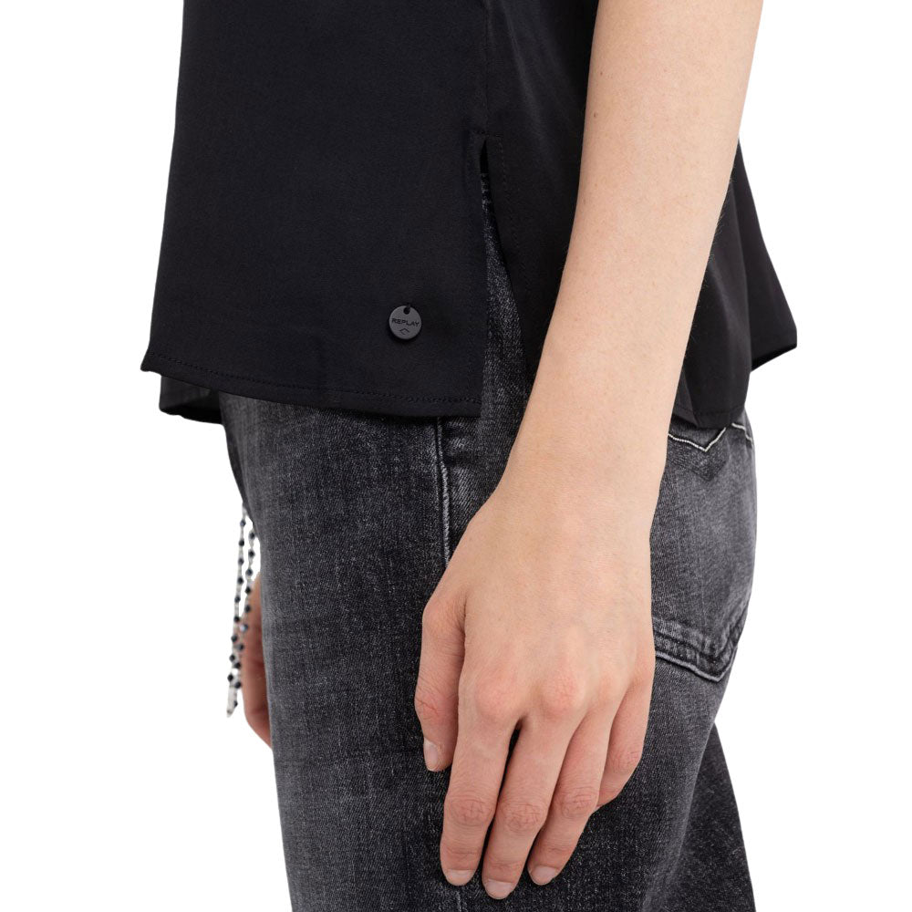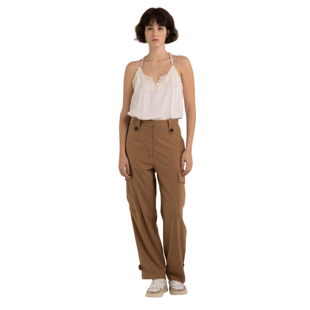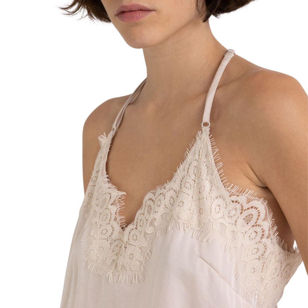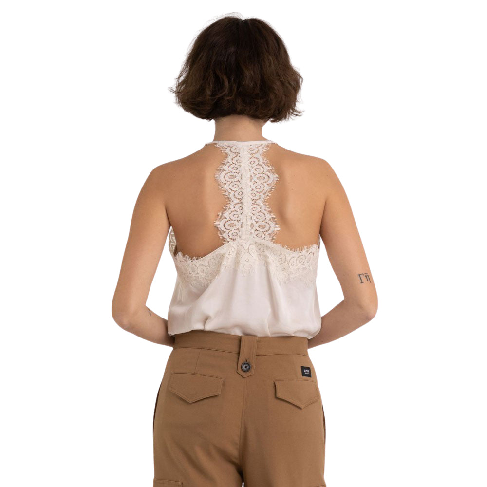 Sleeveless top made of light viscose blend fabric. With adjustable thin shoulder straps, the garment is refined by the contrasting-coloured lace edges on the collar and at the back. With straight fit, the item features two small side slits at the hem.